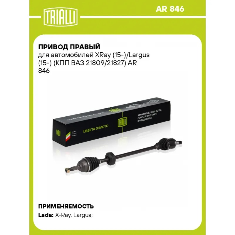 Привод правый для автомобилей XRay (15-)/Largus (15-) (КПП ВАЗ 21809/21827) Характеристики: Артикул: AR 846 OEM номера: 8450020013 Сопутствующие товары:: AR 847, GO 847, FG 846, GO 848, FG 840 Особенности конструкции:: с демпфером Гарантийный срок: 2 года/60 000 км Парный товар: AR 847 Количество на автомобиль: 1 Ось (сторона установки): передняя правая Внешнее зубчатое соединение со стороны колеса (внеш.): 23 Внешнее зубчатое соединение со стороны КПП (внутр.): 24 Длина, мм: 904 Диаметр вала,мм: 24.5 Тип КПП: MT Сопутствующий товар: ШРУСы: GO 848 Сопутствующий товар: Приводы: AR 847 Товарная линейка: BLACK КПП: VAZ 21809/21827 Подходит для авто: ВАЗ X-Ray (15-), Largus (12-) Для проверки применяемости отправьте VIN автомобиля через вкладку "Есть вопросы о товаре?" Комплектация: Привод в сборе - 1 шт Гайка - 1 шт Гарантия: от 1 года.