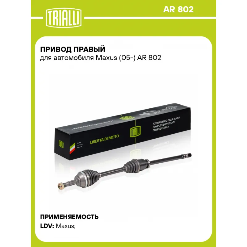 Привод правый для автомобиля Maxus (05-) Характеристики: Артикул: AR 802 OEM номера: 538450102, 538450082 Сопутствующие товары:: GO 802, GO 803, AR 801, FG 801, FG 803 Особенности конструкции:: с ABS Гарантийный срок: 2 года/60 000 км Парный товар: AR 801 Количество на автомобиль: 1 Ось (сторона установки): передняя/правая Внешнее зубчатое соединение со стороны колеса (внеш.): 30 Внешнее зубчатое соединение со стороны КПП (внутр.): 30 Количество зубьев ABS: 48 Длина, мм: 1095 Диаметр вала,мм: 31 Тип КПП: MT Сопутствующий товар: ШРУСы: GO 803, GO 801, GO 802 Сопутствующий товар: Ремонтные комплекты ШРУСов: FG 803, FG 801 Сопутствующий товар: Приводы: AR 801 Товарная линейка: BLACK Подходит для авто: LDV Maxus (05-) Для проверки применяемости отправьте VIN автомобиля через вкладку "Есть вопросы о товаре?" Комплектация: Привод в сборе - 1 шт Гайка - 1 шт Гарантия: от 1 года.