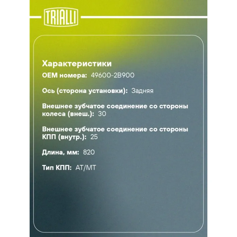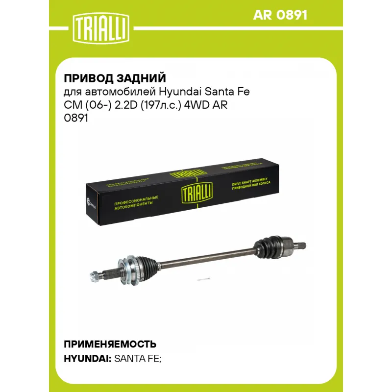 Привод задний для автомобилей Hyundai Santa Fe CM (06-) 2.2D (197л.с.) 4WD Характеристики: Артикул: AR 0891 OEM номера: 49600-2B900 Ось (сторона установки): задняя Длина, мм: 820 Внешнее зубчатое соединение со стороны КПП (внутр.): 25 Количество зубьев ABS: 52 Внешнее зубчатое соединение со стороны колеса (внеш.): 30 Тип КПП: АТ/МТ Гарантийный срок: 2 года/60 000 км Количество на автомобиль: 2 Товарная линейка: BLACK Комплектация: Шплинт - 1 шт Гайка - 1 шт Привод в сборе - 1 шт Гарантия: от 1 года.