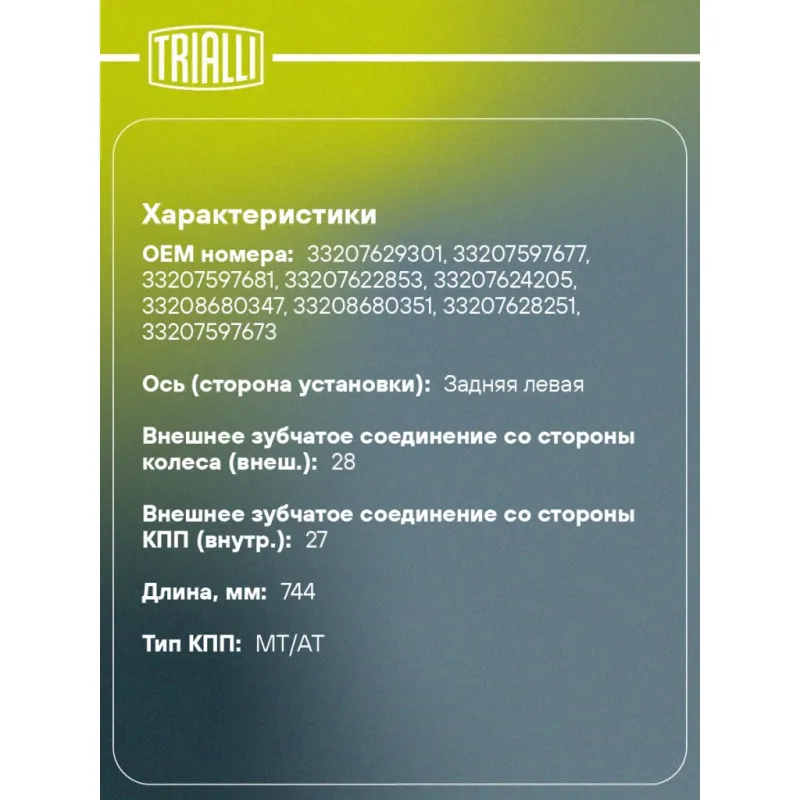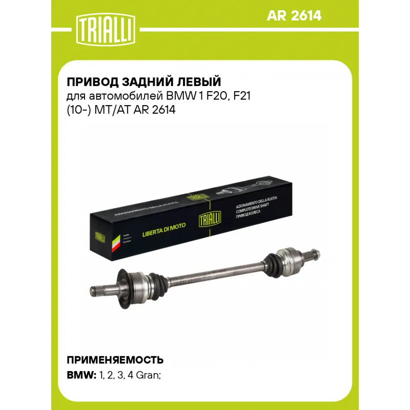 Привод задний левый для автомобилей BMW 1 F20, F21 (10-) MT/AT Характеристики: Артикул: AR 2614 OEM номера: 33207629301, 33207597677, 33207597681, 33207622853, 33207624205, 33208680347, 33208680351, 33207628251, 33207597673 Гарантийный срок: 2 года/60 000 км Парный товар: AR 2612 Количество на автомобиль: 1 Ось (сторона установки): задняя левая Внешнее зубчатое соединение со стороны колеса (внеш.): 28 Внешнее зубчатое соединение со стороны КПП (внутр.): 27 Длина, мм: 744 Тип КПП: MT/AT Товарная линейка: BLACK Комплектация: Привод в сборе - 1 шт Гайка - 1 шт Гарантия: от 1 года.