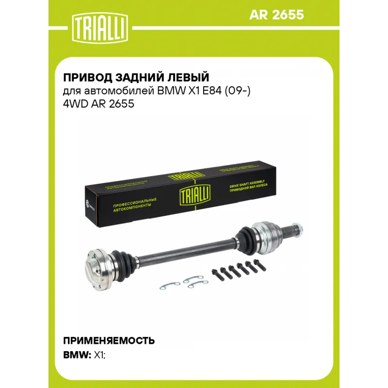 Привод задний левый для автомобилей BMW X1 E84 (09-) 4WD Характеристики: Артикул: AR 2655 OEM номера: 33207591595, 33207605485 Ось (сторона установки): задняя левая Длина, мм: 605,5 Внешнее зубчатое соединение со стороны колеса (внеш.): 30 Диаметр вала,мм: 28 Тип КПП: AT/MT Гарантийный срок: 2 год/60 000км Сопутствующий товар: Приводы: AR 2654 Количество на автомобиль: 1 Товарная линейка: BLACK Комплектация: Привод в сборе - 1 шт Гайка - 1 шт Болт - 6 шт Гарантия: от 1 года.