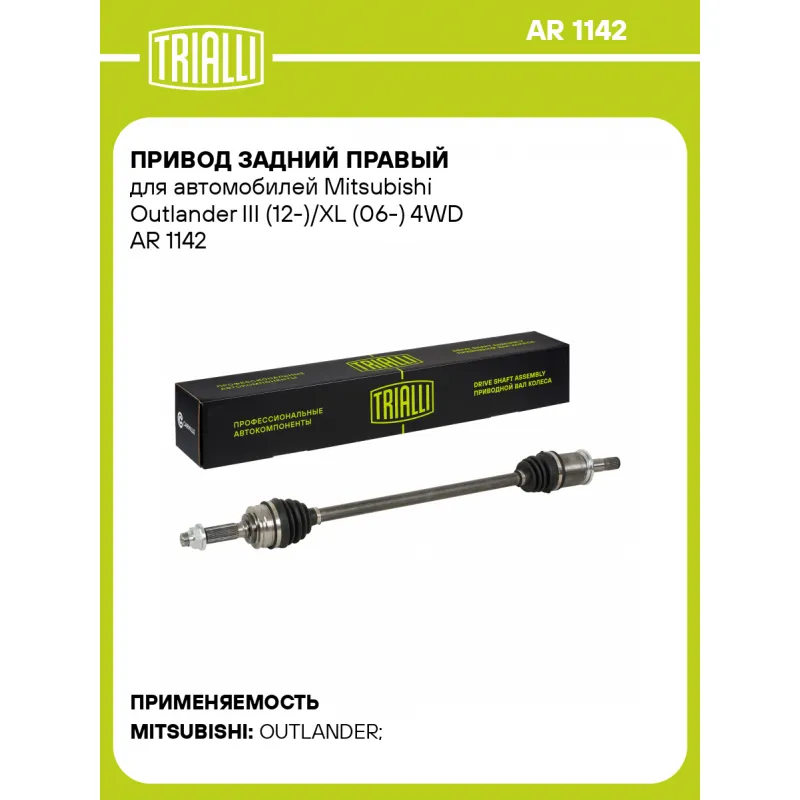 Привод задний правый для автомобилей Mitsubishi Outlander III (12-)/XL (06-) 4WD Характеристики: Артикул: AR 1142 OEM номера: 3715A320, 3715A204, 3715A008 Ось (сторона установки): задняя, правая Длина, мм: 835 Внешнее зубчатое соединение со стороны КПП (внутр.): 23 Внешнее зубчатое соединение со стороны колеса (внеш.): 25 Тип КПП: CVT, AT Гарантийный срок: 2 года/60 000 км Сопутствующий товар: ШРУСы: GO 1161, GO 1173 Сопутствующий товар: Приводы: AR 1141, AR 1133, AR 1138 Парный товар: AR 1141 Количество на автомобиль: 1 Товарная линейка: BLACK Комплектация: Гайка - 1 шт Привод в сборе - 1 шт Гарантия: от 1 года.