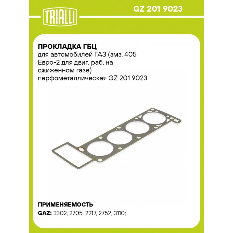 Прокладка ГБЦ для автомобилей ГАЗ (змз. 405 Евро-2 для двиг. раб. на сжиженном газе) перфометаллическая Характеристики: Артикул: GZ 201 9023 OEM номера: 405.1003020 Количество на автомобиль: 1 Толщина, мм: 1.9 Особенности конструкции:: для двигателей работающих на сжиженном газе (змз. 405 Евро 2) Толщина, мм (номинальная): 1,6 Материал: перфометалл Ширина в затяге, мм: 1.47 Гарантийный срок: 2 года/60 000 км. Диаметр (мм): 97.5 Подходит для авто: ГАЗ 3302, 3302, 2705, 2705, 2217, 2217, 2752, 2752, 3110 Для проверки применяемости отправьте VIN автомобиля через вкладку "Есть вопросы о товаре?" Гарантия: от 1 года.