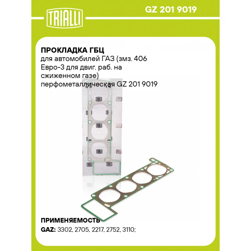 Прокладка ГБЦ для автомобилей ГАЗ (змз. 406 Евро-3 для двиг. раб. на сжиженном газе) перфометаллическая Характеристики: Артикул: GZ 201 9019 OEM номера: 406.1003020 Количество на автомобиль: 1 Толщина, мм: 1.9 Особенности конструкции:: змз. 406 Евро-3 для двигателей работающих на сжиженном газе Толщина, мм (номинальная): 1,6 Материал: перфометалл Ширина в затяге, мм: 1.47 Гарантийный срок: 2 года/60 000 км. Диаметр (мм): 95 Подходит для авто: ГАЗ 3302, 3302, 2705, 2705, 2217, 2217, 2752, 2752, 3110 Для проверки применяемости отправьте VIN автомобиля через вкладку "Есть вопросы о товаре?" Гарантия: от 1 года.