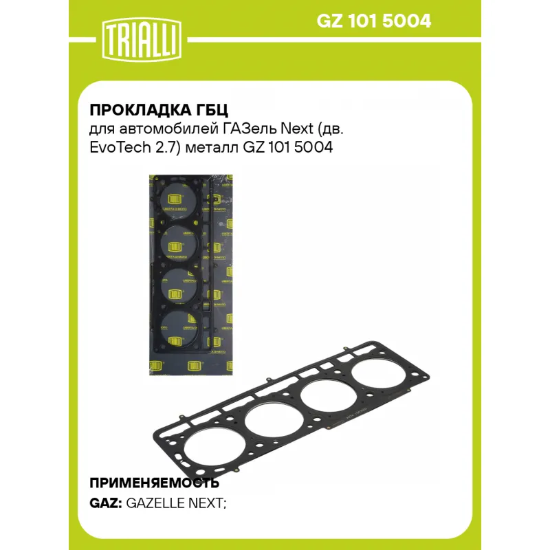 Прокладка ГБЦ для автомобилей ГАЗель Next (дв. EvoTech 2.7) металл Характеристики: Артикул: GZ 101 5004 OEM номера: A274.1003020, 719-73-30 Материал: металл Гарантийный срок: 2 года/60 000 км. Количество на автомобиль: 1 Комплектация: Прокладка ГБЦ - 1 шт Гарантия: от 1 года.