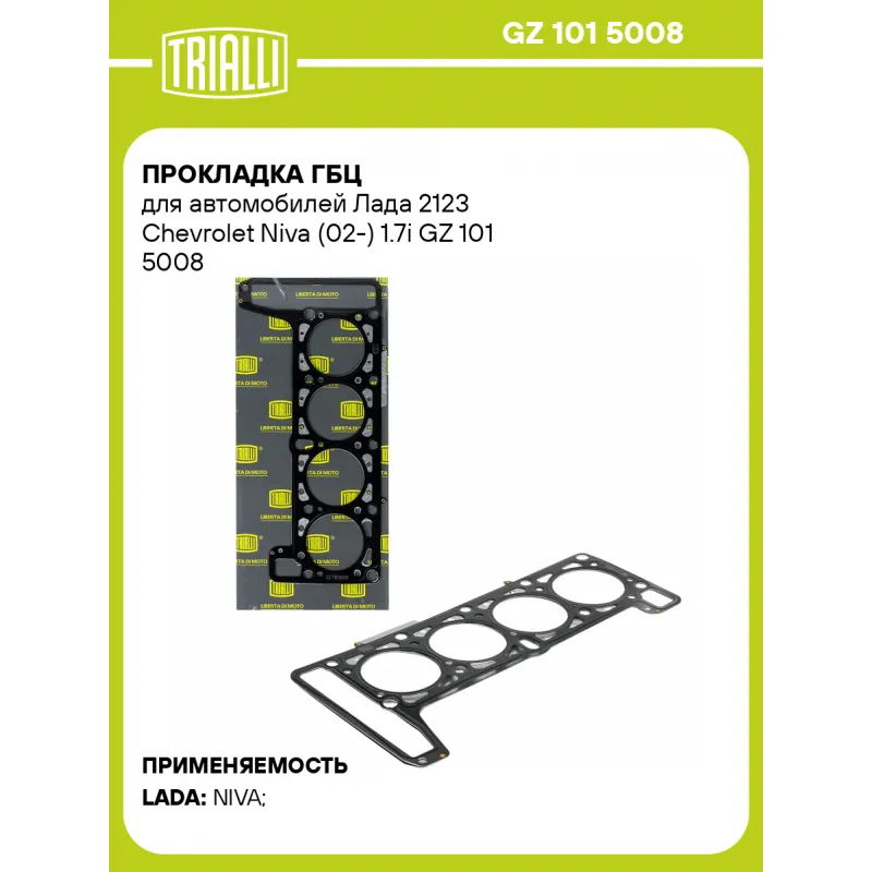 Прокладка ГБЦ для автомобилей Лада 2123 Chevrolet Niva (02-) 1.7i Характеристики: Артикул: GZ 101 5008 OEM номера: 21214-1003020, 21214-1003020-02 Гарантийный срок: 2 года/60 000 км. Кол-во слоев: 3 Количество на автомобиль: 1 Толщина, мм (номинальная): 2,0 Ширина в затяге, мм: 1.12 Диаметр (мм): 83.8 Комплектация: Прокладка ГБЦ - 1 шт Гарантия: от 1 года.