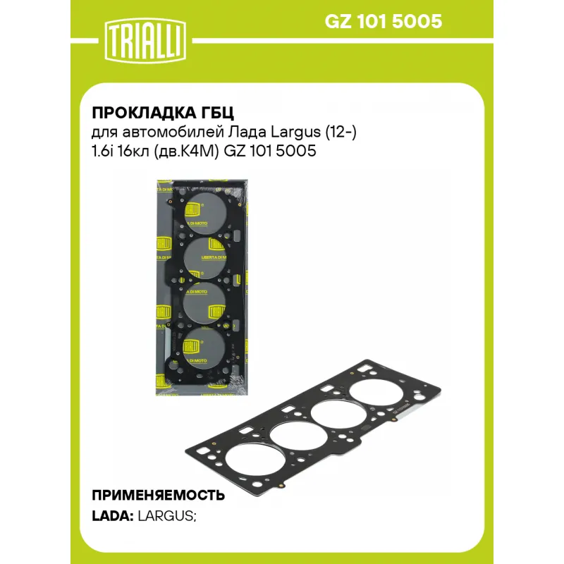 Прокладка ГБЦ для автомобилей Лада Largus (12-) 1.6i 16кл (дв.К4М) Характеристики: Артикул: GZ 101 5005 OEM номера: 110446721r, 8200356346 Гарантийный срок: 2 года/60 000 км. Количество на автомобиль: 1 Толщина, мм (номинальная): 1,5 Ширина в затяге, мм: 1.12 Диаметр (мм): 80 Комплектация: Прокладка ГБЦ - 1 шт Гарантия: от 1 года.