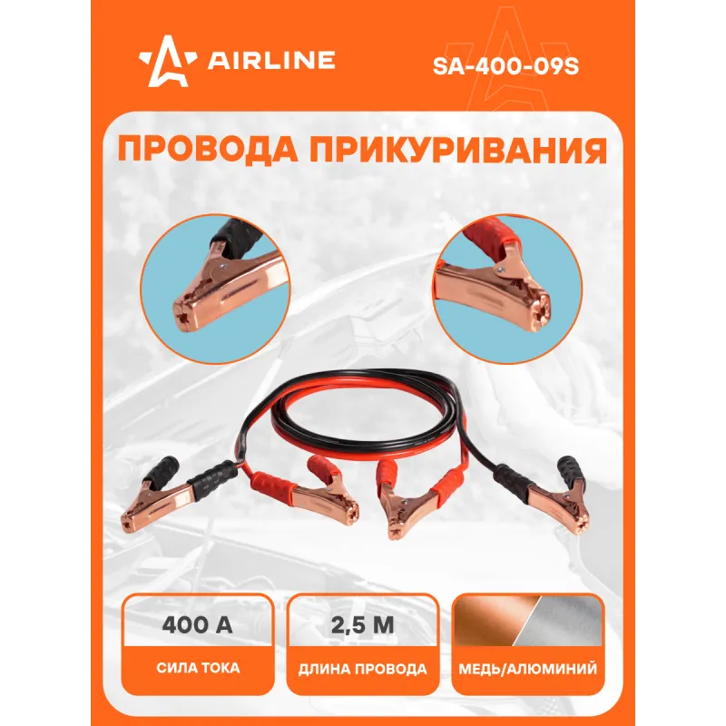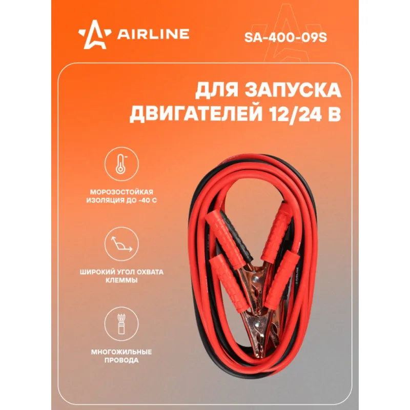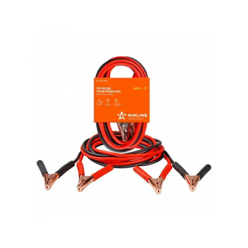 Провода прикуривания 400А (2,5м, 12/24В) Описание: Пусковые провода прикуривания AIRLINE предназначены для запуска двигателей легковых автомобилей и мотоциклов (6/12/24В) с разряженной аккумуляторной батареей. Улучшенное соединение проводов с крокодилами и морозостойкая оплетка делает данные провода надежным помощником на много зим вперед. Позволяет производить запуск двигателя в условиях низких температур (-40С) благодаря прочной морозостойкой оплетке. При этом оплетка не потрескается и провод не развалится после первого использования. Зажимы с широким углом охвата позволяют с легкостью крепить провода на любой тип клемм аккумулятора. Будет хорошим приобретением в подарок себе, мужу, брату, другу и каждому автомобилисту. Характеристики: Артикул: SA-400-09S Сила тока, А: 400 Диаметр провода, мм: 9 Сечение провода, кв.мм: 10 Рабочая температура, C: от - 40 до + 80 Длина провода, м: 2,5 Комплектация: Пусковые провода с крокодилами (красный/черный) в картонном рукаве - 1 пар Гарантия: от 1 года.