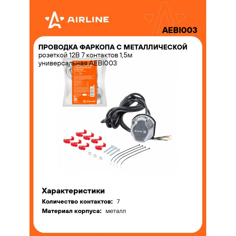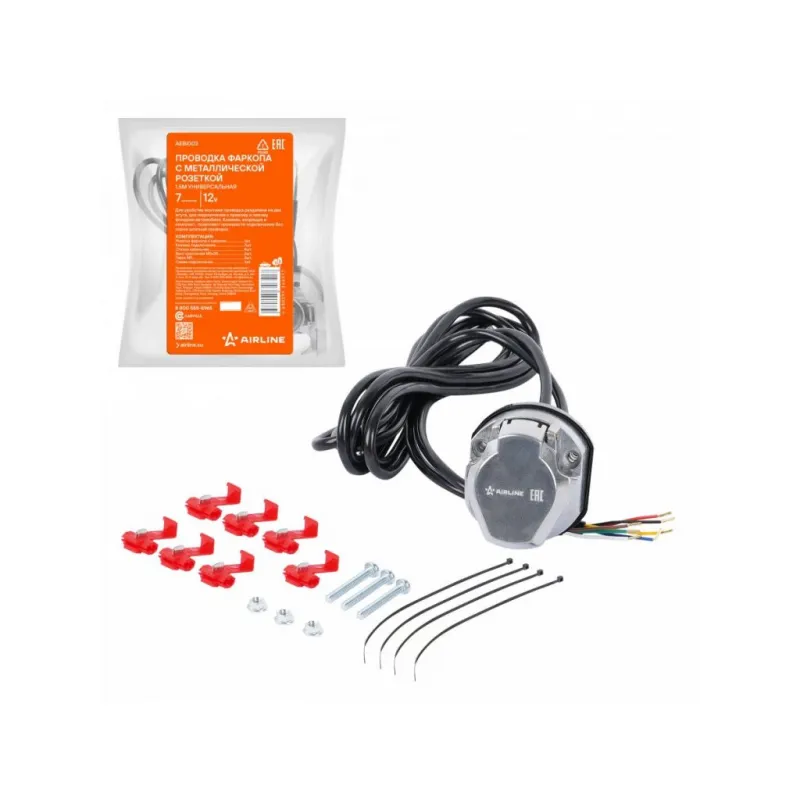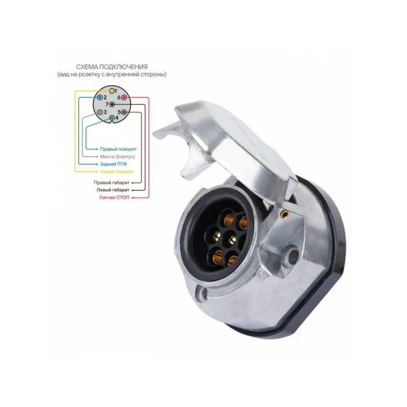 Проводка фаркопа с металлической розеткой 12В 7 контактов 1,5м универсальная Описание: Корпус розетки выполнен из металла. Электрические разъёмы из латуни обеспечивают надёжный контакт. Резиновые уплотнители защищают от грязи и влаги. Провода и клеммы, входящие в комплект, позволяют без порчи штатной проводки автомобиля подключиться к проводам левого и правого фонарей. Характеристики: Артикул: AEBI003 Количество контактов: 7 Материал корпуса: металл Длина кабеля, м: 1.5 Комплектация: Винт крепления М5х35 - 3 шт Розетка фаркопа с кабелем - 1 шт Клемма подключения - 7 шт Стяжка кабельная - 4 шт Гайка М5 - 3 шт Схема подключения - 1 шт Гарантия: от 1 года.