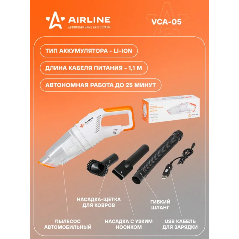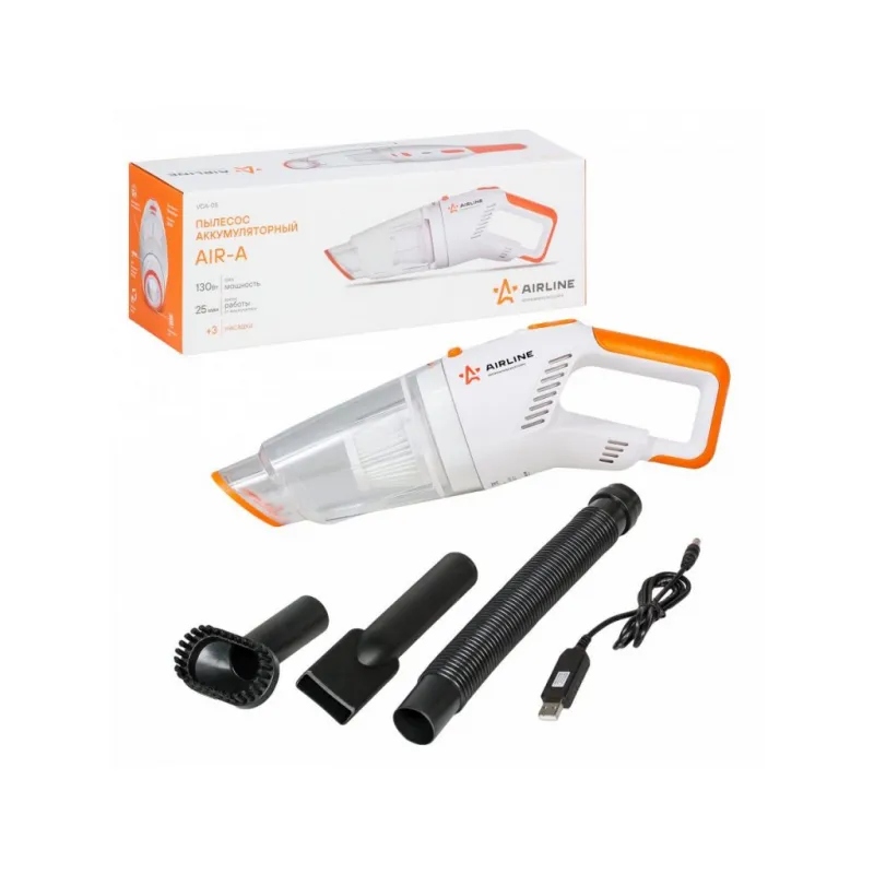 Пылесос аккумуляторный (беспроводной) AIR-A 4000PA (130Вт, 0.5л, 2000 mAh) Описание: Проводной автомобильный ручной пылесос AIR-A модель VCA-05 бренда AIRLINE - мощный аксессуар для сухой уборки, изготовленный из морозостойких материалов. Питание пылесоса происходит от бортовой электросети 12В через USB. Для удобства хранения и эксплуатации, пылесос комплектуется отсоединяемым USB кабелем питания длиной 1.1 метра. Прозрачный пылесборник в виде контейнера объемом позволит вам легко контролировать его наполненность. Это поможет избежать падения мощности всасывания и высыпания мусора. Неоспоримым преимуществом пылесоса является сменный HEPA фильтр, который задерживает в пылесборнике даже мельчайшую пыль размером до 0,3 микрон. Это практичное устройство с удобной ручкой идеально подходит для очищения салона и приборной панели как легковых, так и грузовых автомобилей. Полезный и компактный аксессуар можно использовать не только в машине, гараже, но и для уборки дома. С его помощью вы сможете очистить от мусора мебель, матрас, кровать, поверхность дивана или кресла. Удобная техника для ухода за машиной станет универсальным подарком для автомобилиста. Характеристики: Артикул: VCA-05 Мощность, Вт: 130 Максимальный ток, А: 1,5 Длина кабеля питания, м: 1,1 Максимальное вакуумное давление, Па: 4000 Напряжение питания, В: 5 Объем пылесборника, мл: 500 Тип фильтра: HEPA фильтр (задерживает частицы до 0,3 мк) Время непрерывной работы: 25 минут Время полной зарядки: 5 часов Ёмкость встроенного аккумулятора: 2000 мАч Тип аккумулятора: Li-ion Питание аккумулятора: от USB Сменный фильтр: AVCF003 Комплектация: Пылесос автомобильный - 1 шт USB кабель для зарядки - 1 шт Гибкий шланг - 1 шт Насадка с узким носиком - 1 шт Насадка-щетка - 1 шт Паспорт изделия - 1 шт Гарантийный талон - 1 шт Упаковочная коробка - 1 шт Гарантия: от 1 года.