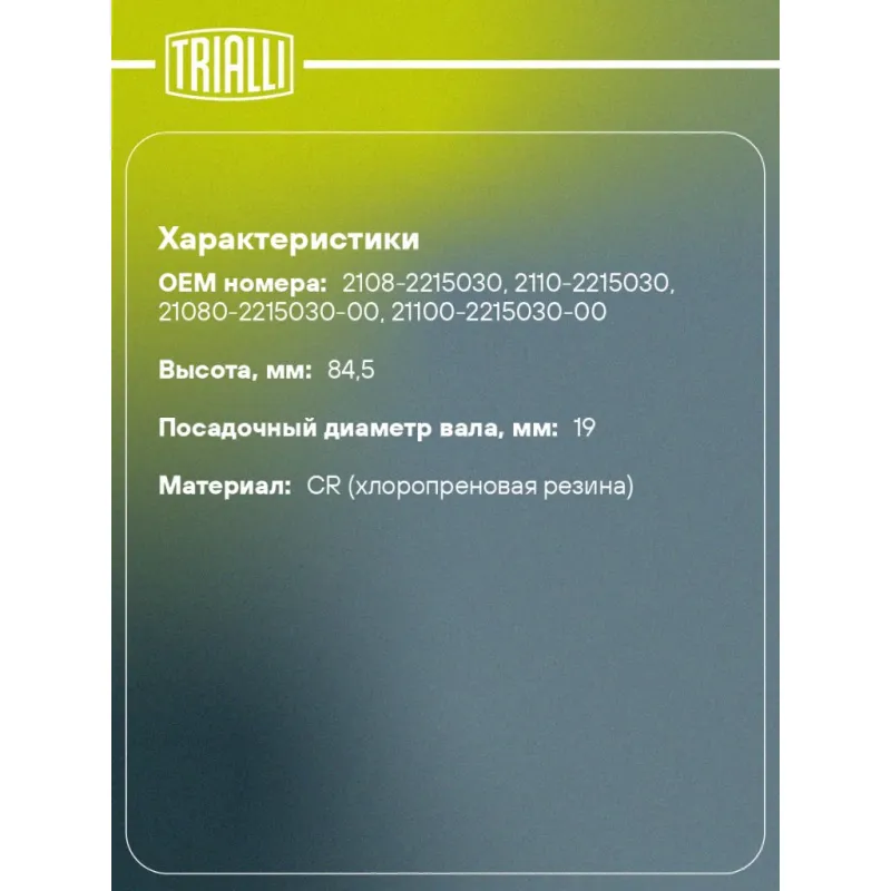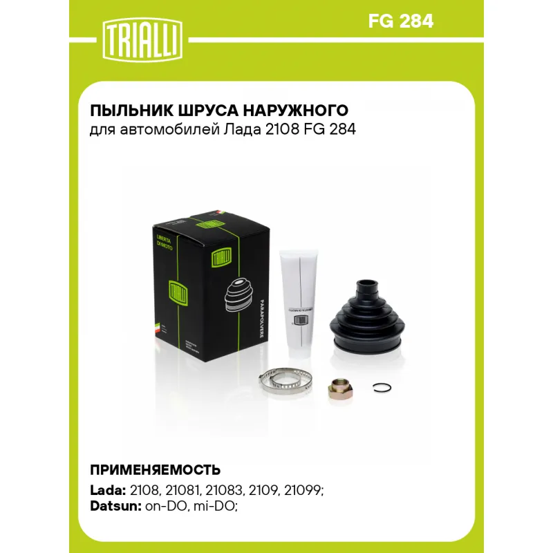 Пыльник ШРУСа наружного для автомобилей Лада 2108 Характеристики: Артикул: FG 284 OEM номера: 2108-2215030, 2110-2215030, 21080-2215030-00, 21100-2215030-00 Сторона установки: со стороны колеса, передняя ось Количество на автомобиль: 2 Высота, мм: 84.5 Гарантийный срок: 1 год/30 000 км Наружный диаметр ШРУСа, мм: 78 Посадочный диаметр вала, мм: 19 Материал: CR (хлоропреновая резина) Товарная линейка: BLACK Подходит для авто: ВАЗ 2108, 2108, 21081, 21083, 2109, 2109, 21099, 21099, 21099, 2110, 2110, 2111, 2111, 2112, 2112, Priora (07-), Kalina (04-), Kalina (04-), Kalina II (13-), Granta (10-), 2108, 2108, 2109, 2109, 21099, 21099, 2110, 2111, 2112, Priora (07-), Priora (07-), Kalina (04-), Kalina (04-), Kalina II (13-), Granta (10-) Datsun on-DO (14-), mi-DO (15-) Для проверки применяемости отправьте VIN автомобиля через вкладку "Есть вопросы о товаре?" Комплектация: Чехол ШРУСа - 1 шт Стопорное кольцо - 1 шт Гайка - 1 шт Хомут - 2 шт Тюбик со смазкой - 1 шт Гарантия: от 1 года.