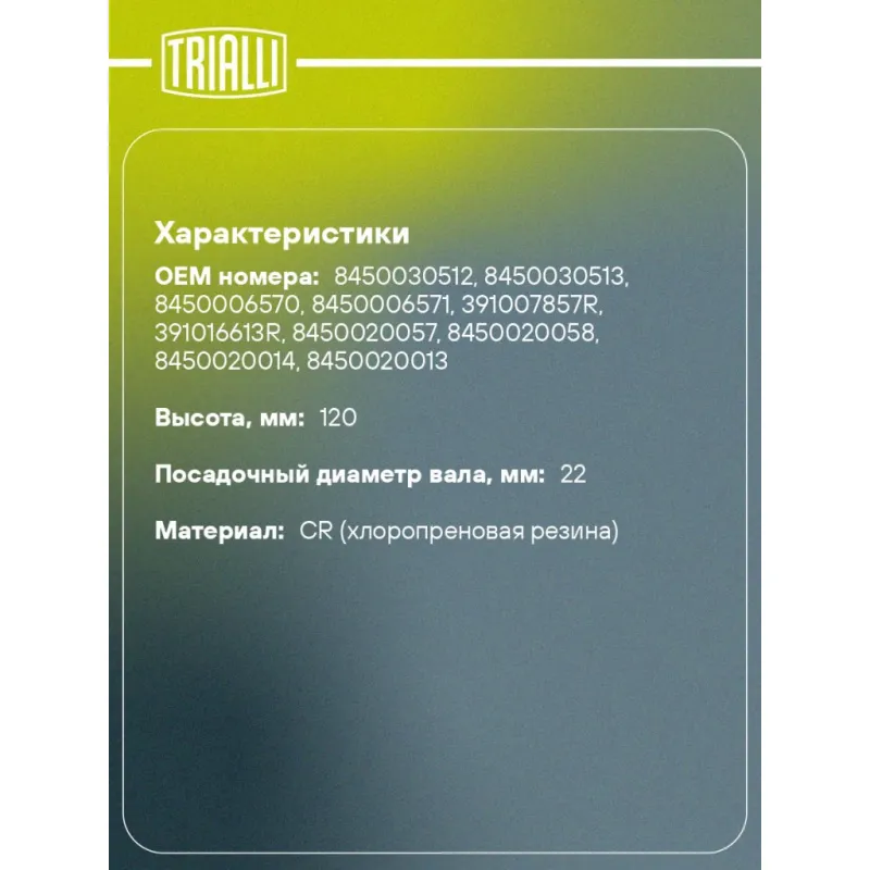 Пыльник ШРУСа наружного для автомобилей Лада Vesta (15-)/X-Ray (15-)/Granta (10-) Характеристики: Артикул: FG 840 OEM номера: 8450030512, 8450030513, 8450006570, 8450006571, 391007857R, 391016613R, 8450020057, 8450020058, 8450020014, 8450020013 Сторона установки: со стороны колеса, передняя ось Количество на автомобиль: 2 Сопутствующие товары:: AR 840, AR 841, AR 842, AR 843, GO 840 Высота, мм: 120 Гарантийный срок: 1 год/30 000 км Наружный диаметр ШРУСа, мм: 76 Посадочный диаметр вала, мм: 22 Материал: CR (хлоропреновая резина) Товарная линейка: BLACK КПП: Renault JH3/ ВАЗ 2180/ АКПП Jatco (Nissan) JF414E Подходит для авто: ВАЗ Vesta (15-), X-Ray (15-), Granta (10-), Largus (12-) Для проверки применяемости отправьте VIN автомобиля через вкладку "Есть вопросы о товаре?" Комплектация: Чехол ШРУСа - 1 шт Стопорное кольцо - 1 шт Хомут - 2 шт Тюбик со смазкой - 1 шт Гарантия: от 1 года.