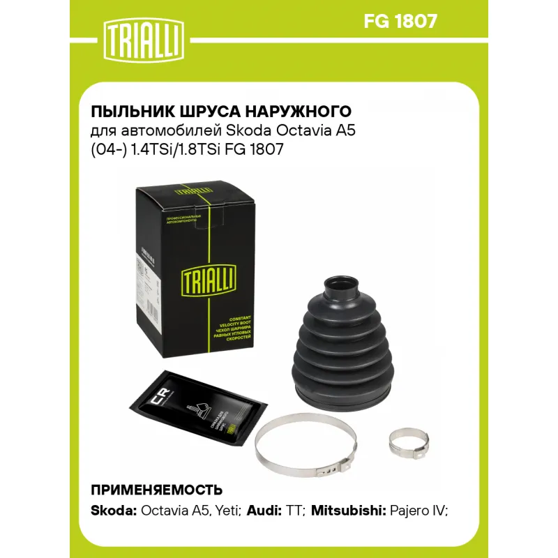Пыльник ШРУСа наружного для автомобилей Skoda Octavia A5 (04-) 1.4TSi/1.8TSi Характеристики: Артикул: FG 1807 OEM номера: K05066025AA, K05066025AB, K05189278AA, K05189279AA, K05015967AA, 5189278AA, 05189279AA, 5189279AA, 5015967AA, 5066025AA, 05066025AB, 5066025AB, 05189278AA, 05066025AA, 3815A200, 3815A195, 3815A196, 3815A199, 04428-28110, 04428-42120, 04428-78030, 1J0498203C, 1K0407285K, 1K0498203A, 3B0498203E Сторона установки: со стороны колеса, передняя ось Количество на автомобиль: 2 Высота, мм: 120 Гарантийный срок: 1 год/30 000 км Наружный диаметр ШРУСа, мм: 94.8 Посадочный диаметр вала, мм: 29.4 Материал: TPEE (термопласт) Товарная линейка: BLACK Подходит для авто: Skoda Octavia A5 (04-), Yeti (09-), Octavia A5 (04-), Yeti (09-) Audi TT (06-) Mitsubishi Pajero IV (06-), Pajero IV (06-) Для проверки применяемости отправьте VIN автомобиля через вкладку "Есть вопросы о товаре?" Комплектация: Чехол ШРУСа - 1 шт Хомут - 2 шт Смазка - 1 туба Гарантия: от 1 года.