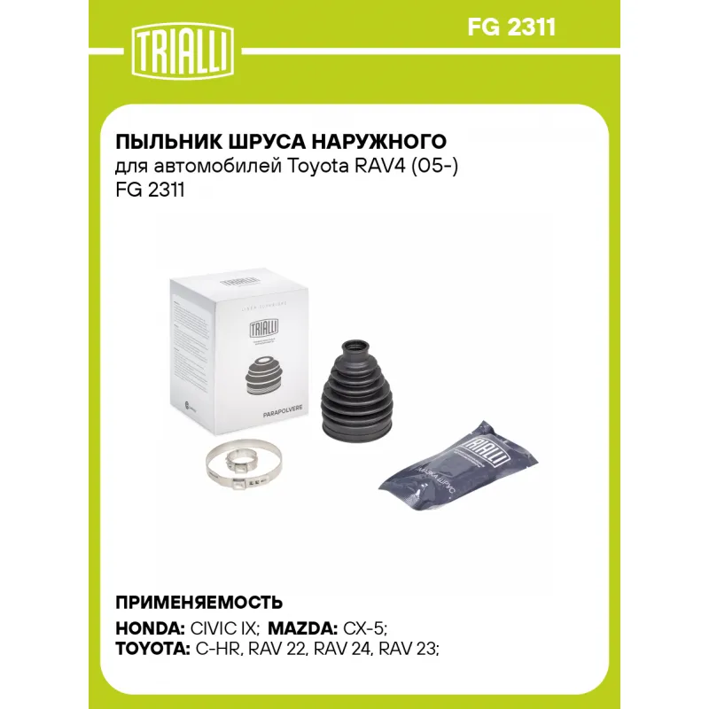 Пыльник ШРУСа наружного для автомобилей Toyota RAV4 (05-) Характеристики: Артикул: FG 2311 OEM номера: 44017-TV1-G00, RTA1-22-530, 04429-12030 Сторона установки: со стороны колеса, передняя ось Количество на автомобиль: 2 Высота, мм: 98 Гарантийный срок: 1 год/30 000 км Наружный диаметр ШРУСа, мм: 66.5 Посадочный диаметр вала, мм: 22 Материал: TPEE (термопласт) Товарная линейка: BLACK Комплектация: Чехол ШРУСа - 1 шт Хомут - 2 шт Смазка - 1 туба Гарантия: от 1 года.