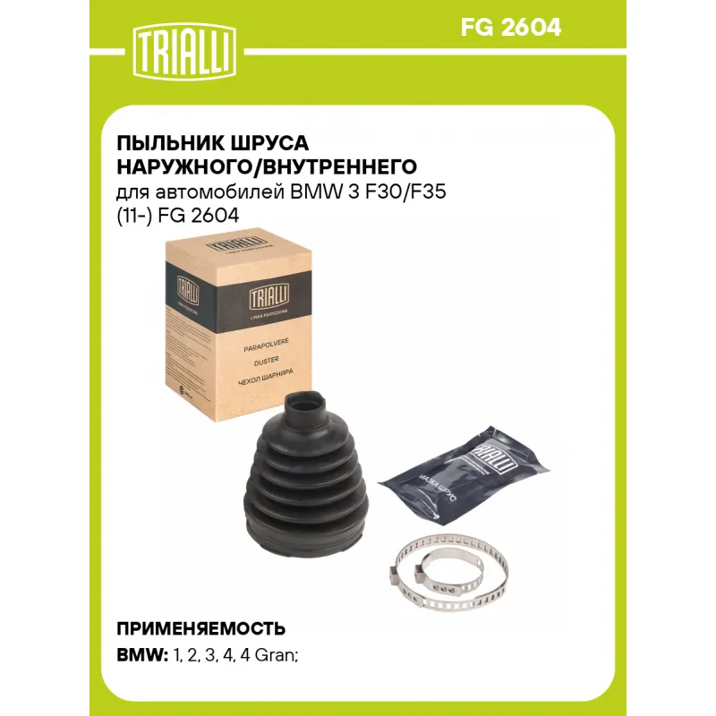 Пыльник ШРУСа наружного/внутреннего для автомобилей BMW 3 F30/F35 (11-) Характеристики: Артикул: FG 2604 OEM номера: 33207609351, 33207609352 Материал: CR Высота, мм: 100 Гарантийный срок: 1 год/30 000км Посадочный диаметр вала, мм: 20 Наружный диаметр ШРУСа, мм: 71 Сторона установки: правая, левая Количество на автомобиль: 2 Товарная линейка: BLACK Комплектация: Чехол ШРУСа - 1 шт Хомут - 2 шт Смазка - 1 туба Гарантия: от 1 года.