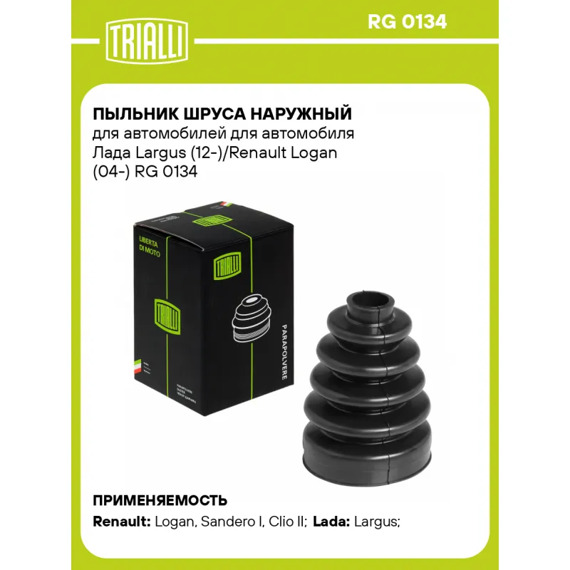 Пыльник ШРУСа наружный для автомобилей для автомобиля Лада Largus (12-)/Renault Logan (04-) Характеристики: Артикул: RG 0134 OEM номера: 6001550547, 7701209242 Гарантийный срок: 1 год/30 000 км Сторона установки: со стороны колеса, передняя ось Товарная линейка: BLACK Количество на автомобиль: 2 Высота, мм: 117 Наружный диаметр ШРУСа, мм: 75 Посадочный диаметр вала, мм: 23 Материал: CR (хлоропреновая резина) Подходит для авто: Renault Logan (04-), Sandero I (09-), Clio II (98-), Kangoo (97-), Symbol II (08-), Twingo (07-), Logan (04-), Logan (08-), Clio II (98-), Clio III (05-), Clio III (05-), Clio III (05-), Megane II (02-), Symbol (01-) ВАЗ Largus (12-) Для проверки применяемости отправьте VIN автомобиля через вкладку "Есть вопросы о товаре?" Комплектация: Пыльник (чехол) ШРУС - 1 шт Гарантия: от 1 года.