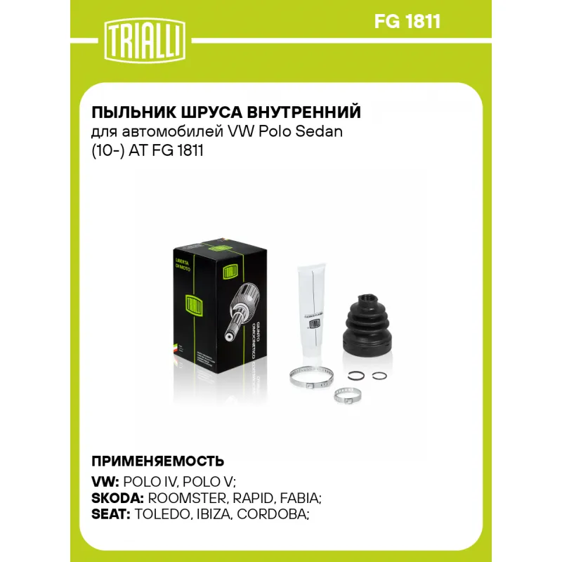 Пыльник ШРУСа внутренний для автомобилей VW Polo Sedan (10-) AT Характеристики: Артикул: FG 1811 OEM номера: 6QD498201 Сторона установки: со стороны КПП, передняя ось Количество на автомобиль: 2 Сопутствующие товары:: AR 1807, AR 1808, FG 1806 Высота, мм: 95 Гарантийный срок: 1 год/30 000 км Наружный диаметр ШРУСа, мм: 71.5 Посадочный диаметр вала, мм: 22 Материал: CR (хлоропреновая резина) Товарная линейка: BLACK Комплектация: Чехол ШРУСа - 1 шт Стопорное кольцо - 2 шт Хомут - 2 шт Тюбик со смазкой - 1 шт Гарантия: от 1 года.