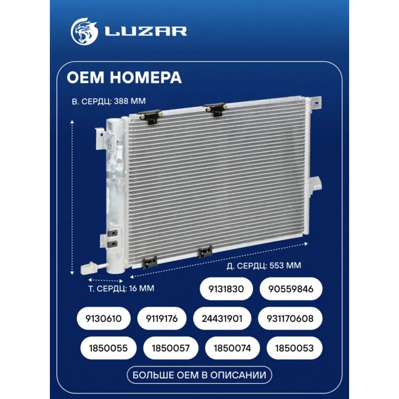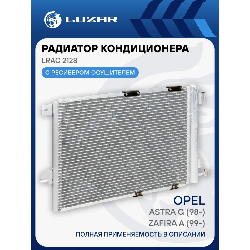 Радиатор кондиционера для автомобилей Astra G (98-)/Zafira A (99-) M/A Характеристики: Артикул: LRAC 2128 OEM номера: 1850055, 1850057, 1850074, 1850053, 09130610, 9119176, 24431901, 931170608, 9131830, 90559846, 95515191, 1850292 Количество на автомобиль: 1 Длина сердцевины, мм: 553 Высота сердцевины, мм: 388 Толщина сердцевины, мм: 16 Сопутствующий товар: Радиаторы охлаждения: LRc 21150; LRc 2149; LRc 2150 Сопутствующий товар: Компрессоры кондиционера: LCAC 2129 осушитель: + Подходит для авто: Opel Astra G (98-), Zafira A (99-), Astra G (98-), Zafira A (99-) Для проверки применяемости отправьте VIN автомобиля через вкладку "Есть вопросы о товаре?" Комплектация: Паспорт изделия - 1 шт Радиатор кондиционера c ресивером - 1 шт Гарантия: от 1 года.