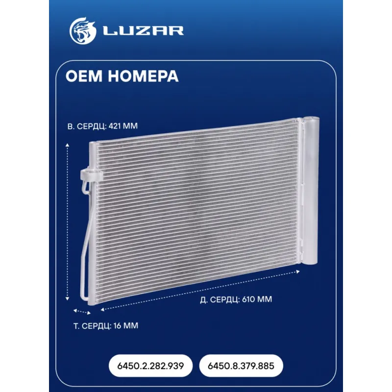 Радиатор кондиционера для автомобилей BMW 5 (E60/61) (03-) Характеристики: Артикул: LRAC 26109 OEM номера: 6450.2.282.939, 6450.8.379.885 Количество на автомобиль: 1 Длина сердцевины, мм: 610 Высота сердцевины, мм: 421 Толщина сердцевины, мм: 16 Сопутствующий товар: Радиаторы охлаждения: LRc 26109; LRc 26119 Сопутствующий товар: Электровентиляторы охлаждения: LFK 26109 Сопутствующий товар: Компрессоры кондиционера: LCAC 2660; LCAC 26E6 Сопутствующий товар: Клапаны расширительные кондиционера (ТРВ): LTRV 2626 осушитель: + Подходит для авто: BMW 5 E60 (03-), 6 E63/E64 (03-), 6 E63/E64 (03-), 7 E65/E66 (01-), 7 E65/E66 (01-), 7 E65/E66 (01-) Для проверки применяемости отправьте VIN автомобиля через вкладку "Есть вопросы о товаре?" Комплектация: Паспорт изделия - 1 шт Радиатор кондиционера c ресивером - 1 шт Гарантия: от 1 года.
