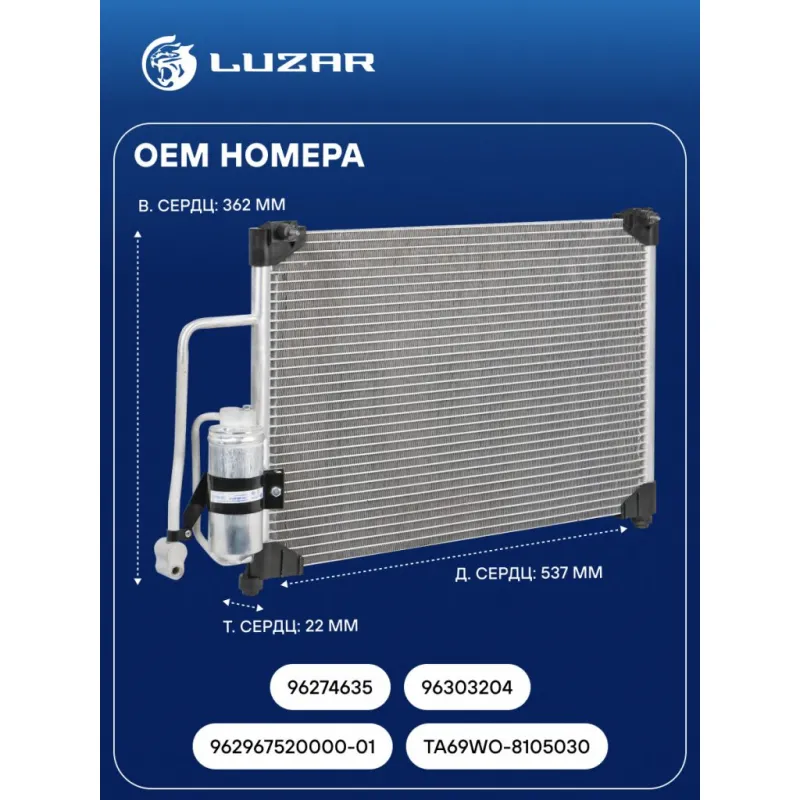 Радиатор кондиционера для автомобилей Chevrolet Lanos (02-) (c ресивером) Характеристики: Артикул: LRAC CHLs0235 OEM номера: 96274635, 96303204, 962967520000-01, TA69WO-8105030 Количество на автомобиль: 1 Длина сердцевины, мм: 537 Высота сердцевины, мм: 362 Толщина сердцевины, мм: 22 Сопутствующий товар: Ресиверы-осушители: LCD 0202; LCR 0535 Сопутствующий товар: Радиаторы охлаждения: LRc 0561; LRc 0561b; LRc 0563; LRc 0563b; LRc CHLs02260 Сопутствующий товар: Электровентиляторы кондиционера: LFc 0563 Сопутствующий товар: Электровентиляторы охлаждения: LFc 0580 Ресивер: + Подходит для авто: Doninvest Assol (L100) ЗАЗ Chance (09-) Daewoo Lanos (97-) Chevrolet Lanos (97-) Для проверки применяемости отправьте VIN автомобиля через вкладку "Есть вопросы о товаре?" Комплектация: Радиатор кондиционера в сборе с ресивером - 1 шт Паспорт изделия - 1 шт Радиатор кондиционера c ресивером - 1 шт Гарантия: от 1 года.
