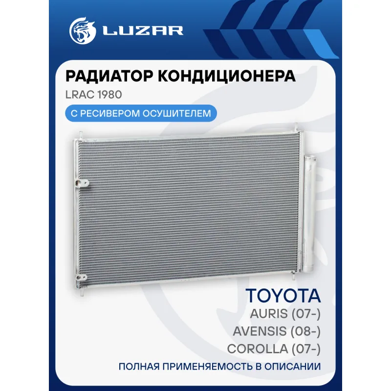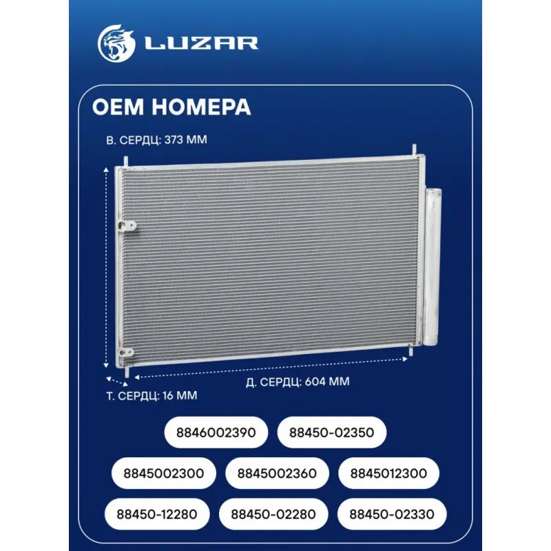 Радиатор кондиционера для автомобилей Corolla (07-)/Auris (07-)/Avensis (08-) Характеристики: Артикул: LRAC 1980 OEM номера: 88450-12280, 88450-02280, 88450-02330 , 8845002300, 8845002360, 8845012300, 8846002390, 88450-02350 Количество на автомобиль: 1 Длина сердцевины, мм: 604 Высота сердцевины, мм: 373 Толщина сердцевины, мм: 16 Сопутствующий товар: Ресиверы-осушители: LCD 0214; LCD 1901 Сопутствующий товар: Радиаторы охлаждения: LRc 19139; LRc 19D4 Сопутствующий товар: Электровентиляторы охлаждения: LFK 1914 Сопутствующий товар: Компрессоры кондиционера: LCAC 19D4 Сопутствующий товар: Клапаны расширительные кондиционера (ТРВ): LTRV 1970 Ресивер: + Подходит для авто: Toyota Corolla E180 (13-), Corolla E150 (06-), Avensis (09-), Auris (06-) Для проверки применяемости отправьте VIN автомобиля через вкладку "Есть вопросы о товаре?" Комплектация: Паспорт изделия - 1 шт Радиатор кондиционера c ресивером - 1 шт Гарантия: от 1 года.