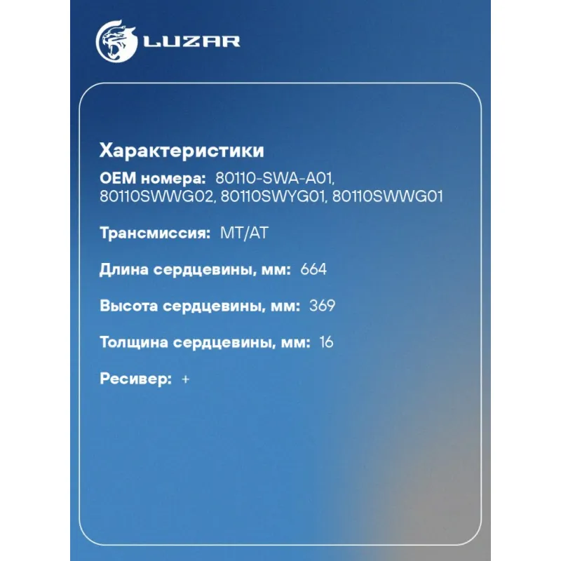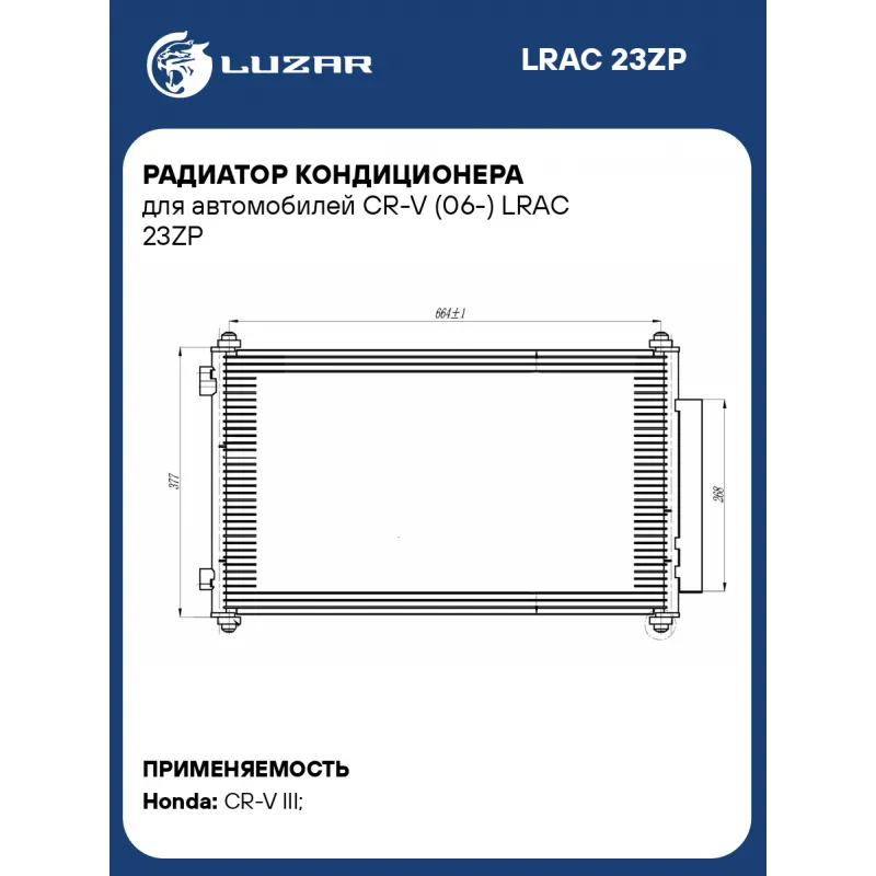 Радиатор кондиционера для автомобилей CR-V (06-) Характеристики: Артикул: LRAC 23ZP OEM номера: 80110-SWA-A01, 80110SWWG02, 80110SWYG01, 80110SWWG01 Количество на автомобиль: 1 Длина сердцевины, мм: 664 Высота сердцевины, мм: 369 Толщина сердцевины, мм: 16 Сопутствующий товар: Радиаторы охлаждения: LRc 231ZA; LRc 231ZP; LRc 23ZP... Читать полностью →
