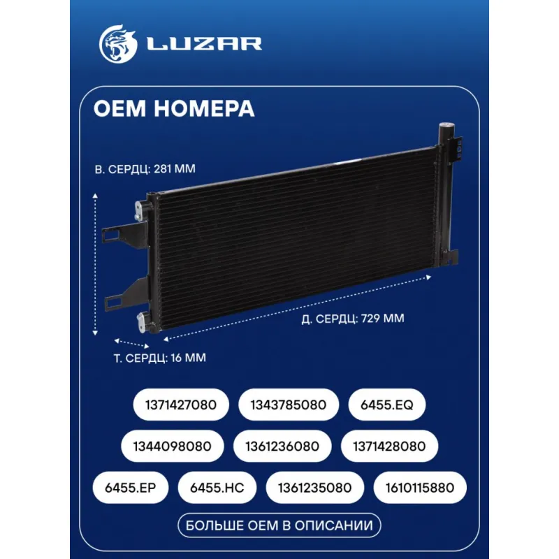 Радиатор кондиционера для автомобилей Ducato/Boxer (06-) Характеристики: Артикул: LRAC 1680 OEM номера: 6455.EP, 6455.HC, 1361235080, 1610115880, 1371427080, 1343785080, 6455.EQ, 1344098080, 1361236080, 1371428080, 1610136780, 1623816180, 1630631880, 1630632180, 1649790580, 6455.FS, 6455HE Количество на автомобиль: 1 Длина сердцевины, мм: 729 Высота сердцевины, мм: 281 Толщина сердцевины, мм: 16 Сопутствующий товар: Радиаторы охлаждения: LRc 1680 Сопутствующий товар: Электровентиляторы охлаждения: LFK 1680 Сопутствующий товар: Компрессоры кондиционера: LCAC 1680; LCAC 1690 Ресивер: + Подходит для авто: Peugeot Boxer (06-), Boxer (06-) Citroen Jumper (06-), Jumper (06-) Fiat Ducato III (06-) Для проверки применяемости отправьте VIN автомобиля через вкладку "Есть вопросы о товаре?" Комплектация: Паспорт изделия - 1 шт Радиатор кондиционера c ресивером - 1 шт Гарантия: от 1 года.