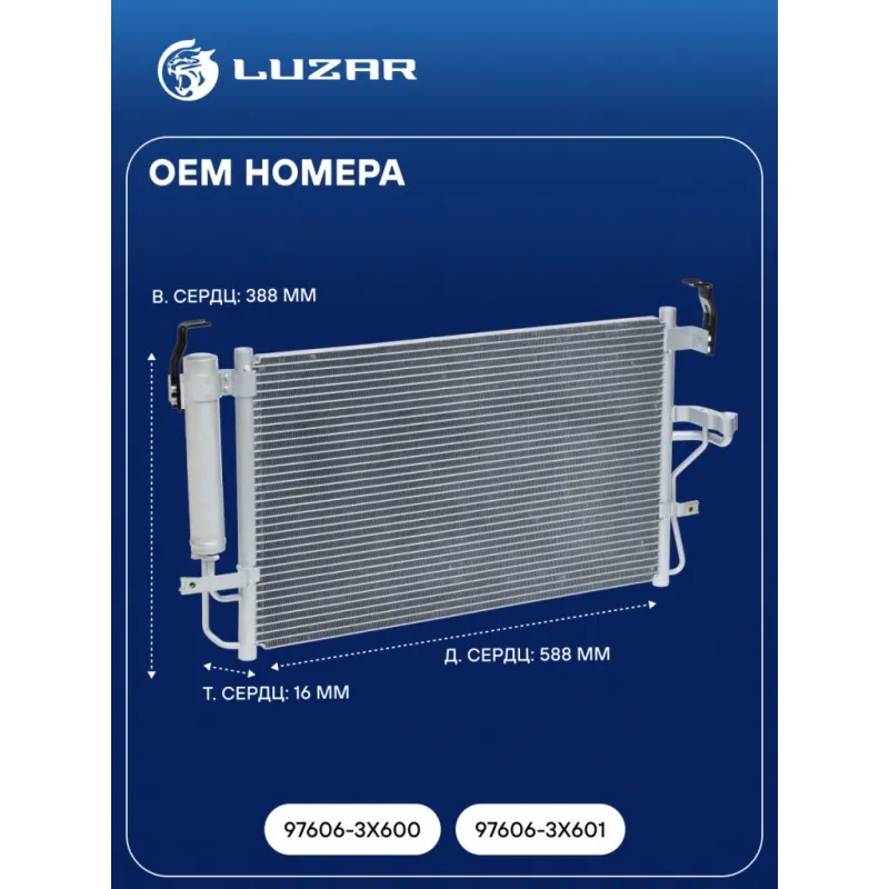 Радиатор кондиционера для автомобилей Elantra (15-)/Cerato (16-) Характеристики: Артикул: LRAC 08X6 OEM номера: 97606-3X600, 97606-3X601 Количество на автомобиль: 1 Длина сердцевины, мм: 588 Высота сердцевины, мм: 388 Толщина сердцевины, мм: 16 Сопутствующий товар: Ресиверы-осушители: LCD 0801 Сопутствующий товар: Радиаторы охлаждения: LRc 081X3; LRc 08X0 Сопутствующий товар: Электровентиляторы охлаждения: LFK 08X0 Сопутствующий товар: Компрессоры кондиционера: LCAC 0865 Сопутствующий товар: Клапаны расширительные кондиционера (ТРВ): LTRV 0865 Комплектующие конденсера: LCD 0801 Ресивер: + Сопутсвующий товар: Датчики давления хладагента: LRPS 0807 Подходит для авто: Hyundai Elantra V (11-), i30 II (11-), Elantra VI (15-) Для проверки применяемости отправьте VIN автомобиля через вкладку "Есть вопросы о товаре?" Комплектация: Паспорт изделия - 1 шт Радиатор кондиционера c ресивером - 1 шт Гарантия: от 1 года.