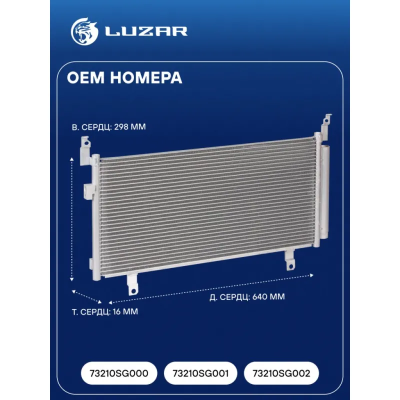 Радиатор кондиционера для автомобилей Forester IV (12-) 2.0i/2.5i M/A Характеристики: Артикул: LRAC 2214 OEM номера: 73210SG000, 73210SG001, 73210SG002 Комплектующие конденсера: LCD 0801 Количество на автомобиль: 1 Длина сердцевины, мм: 640 Высота сердцевины, мм: 298 Толщина сердцевины, мм: 16 Сопутствующий товар: Радиаторы охлаждения: LRc 2214 Подходит для авто: Subaru Forester SJ (12-) Для проверки применяемости отправьте VIN автомобиля через вкладку "Есть вопросы о товаре?" Комплектация: Паспорт изделия - 1 шт Радиатор кондиционера c ресивером - 1 шт Гарантия: от 1 года.