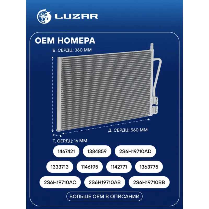 Радиатор кондиционера для автомобилей Fusion (02-)/Fiesta (01-) Характеристики: Артикул: LRAC 1031 OEM номера: 1333713, 1146195, 1142771, 1363775, 1467421, 1384859, 2S6H19710AD, 2S6H19710AC, 2S6H19710AB, 2S6H19710BB, 2S6H19710AA, 5S6H19710BA, 5S6H19710BB, DE94-61-480B, DG40-61-480A, DG40-61-480, ME2S6H19710AC, 5S6J19710BAKT, DE9461480, DE9461480C, 1672022 Сопутствующий товар: Компрессоры кондиционера: LCAC 1031; Количество на автомобиль: 1 Длина сердцевины, мм: 560 Высота сердцевины, мм: 360 Толщина сердцевины, мм: 16 Сопутствующий товар: Ресиверы-осушители: LCR 1006; Сопутствующий товар: Радиаторы охлаждения: LRc 1031 Сопутствующий товар: Электровентиляторы охлаждения: LFK 1031; LFK 1032 Сопутсвующий товар: Датчики давления хладагента: LRPS 1001 Подходит для авто: Ford Fusion (02-), Fiesta (01-) Mazda 2 (03-) Для проверки применяемости отправьте VIN автомобиля через вкладку "Есть вопросы о товаре?" Комплектация: Радиатор кондиционера Паспорт изделия - 1 шт Радиатор кондиционера c ресивером - 1 шт Гарантия: от 1 года.