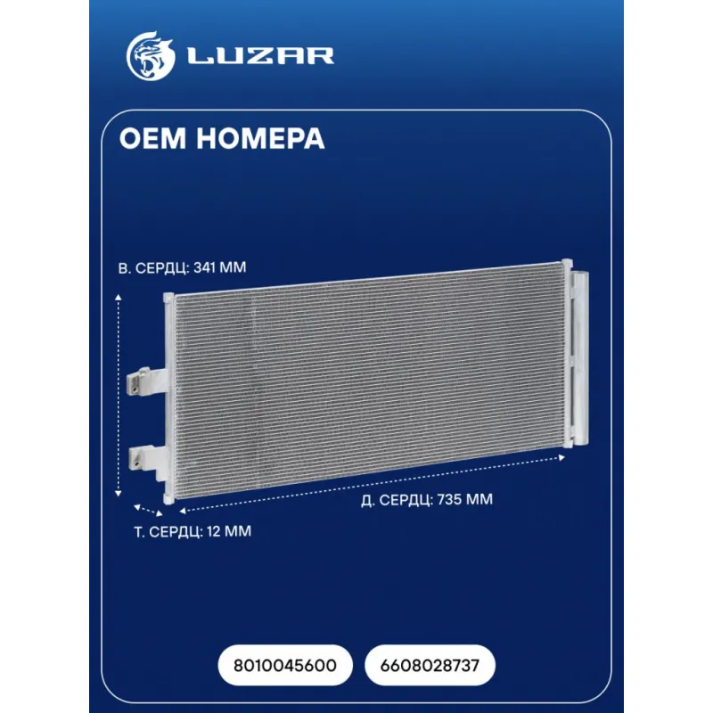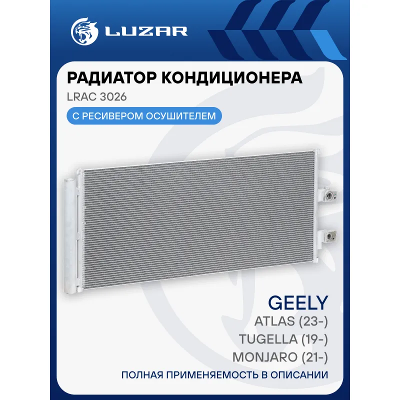 Радиатор кондиционера для автомобилей Geely Tugella (19-)/Monjaro (21-)/Atlas (23-) Характеристики: Артикул: LRAC 3026 OEM номера: 8010045600, 6608028737 Количество на автомобиль: 1 Длина сердцевины, мм: 735 Высота сердцевины, мм: 341 Толщина сердцевины, мм: 12 Сопутствующий товар: Радиаторы охлаждения: LRc 3038 осушитель: + Подходит для авто: Geely Monjaro (21-), Atlas (23-), Tugella (19-) Для проверки применяемости отправьте VIN автомобиля через вкладку "Есть вопросы о товаре?" Комплектация: Паспорт изделия - 1 шт Радиатор кондиционера c ресивером - 1 шт Гарантия: от 1 года.