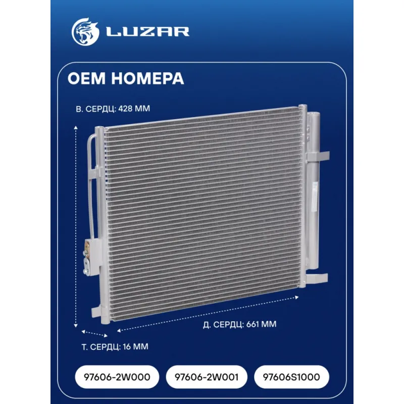 Радиатор кондиционера для автомобилей Hyundai Santa Fe (12-)/(18-) 2.0D/2.2D M/A Характеристики: Артикул: LRAC 0821 OEM номера: 97606-2W000, 97606-2W001, 97606S1000 Комплектующие конденсера: LCD 0801 Количество на автомобиль: 1 Длина сердцевины, мм: 661 Высота сердцевины, мм: 428 Толщина сердцевины, мм: 16 Сопутствующий товар: Ресиверы-осушители: LCD 0801 Сопутствующий товар: Радиаторы охлаждения: LRc 08123 Сопутствующий товар: Электровентиляторы охлаждения: LFK 0822 Сопутствующий товар: Компрессоры кондиционера: LCAC 0822 Ресивер: + Подходит для авто: Hyundai Santa Fe III (12-) Для проверки применяемости отправьте VIN автомобиля через вкладку "Есть вопросы о товаре?" Комплектация: Паспорт изделия - 1 шт Радиатор кондиционера c ресивером - 1 шт Гарантия: от 1 года.