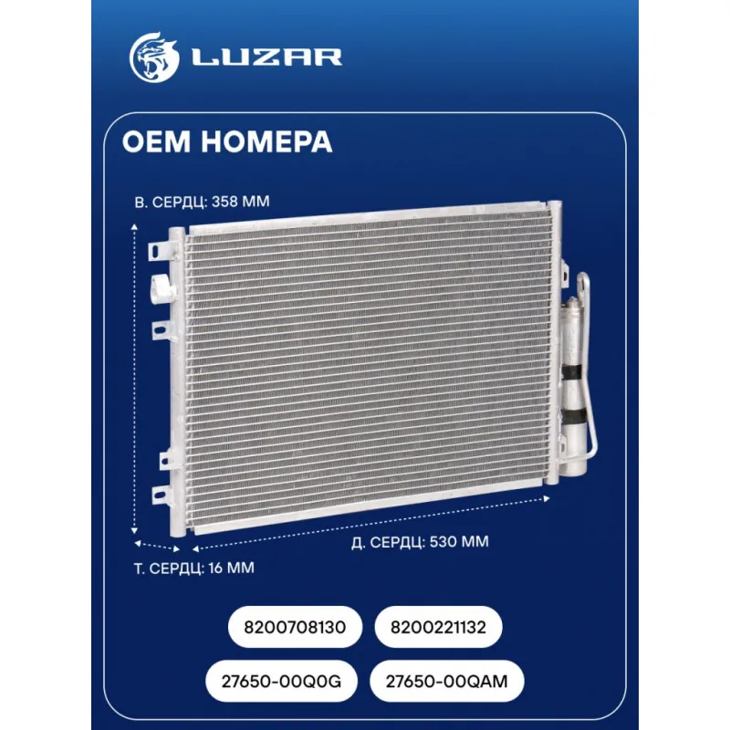 Радиатор кондиционера для автомобилей Kangoo (07-) Характеристики: Артикул: LRAC 0927 OEM номера: 8200708130, 8200221132, 27650-00Q0G, 27650-00QAM Количество на автомобиль: 1 Длина сердцевины, мм: 530 Высота сердцевины, мм: 358 Толщина сердцевины, мм: 16 Сопутствующий товар: Ресиверы-осушители: LCD 0205; LCR 0960 Сопутствующий товар: Радиаторы охлаждения: LRc 0905; LRc RELo04334; LRc RELo04382 Сопутствующий товар: Электровентиляторы охлаждения: LFc 0970 осушитель: + Подходит для авто: Renault Kangoo (97-), Kangoo (97-) Nissan Kubistar (03-) Для проверки применяемости отправьте VIN автомобиля через вкладку "Есть вопросы о товаре?" Комплектация: Радиатор кондиционера в сборе с ресивером - 1 шт Паспорт изделия - 1 шт Радиатор кондиционера c ресивером - 1 шт Гарантия: от 1 года.