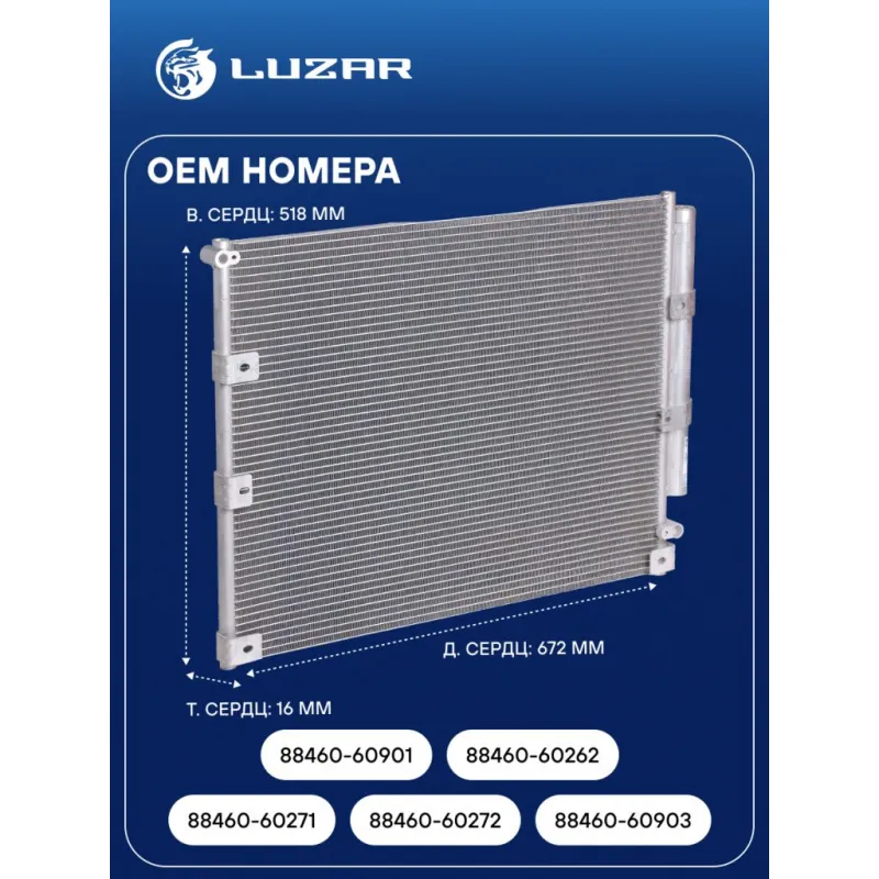Радиатор кондиционера для автомобилей Land Cruiser 100 (98-) M/A Характеристики: Артикул: LRAC 1949 OEM номера: 88460-60271, 88460-60272, 88460-60903, 88460-60901, 88460-60262 Комплектующие конденсера: LCD 0801 Количество на автомобиль: 1 Длина сердцевины, мм: 672 Высота сердцевины, мм: 518 Толщина сердцевины, мм: 16 Сопутствующий товар: Ресиверы-осушители: LCD 0214; LCD 1901 Сопутствующий товар: Радиаторы охлаждения: LRc 1949; LRc 1950 Сопутствующий товар: Электровентиляторы кондиционера: LFAC 1950 Сопутствующий товар: Компрессоры кондиционера: LCAC 1950 Сопутствующий товар: Клапаны расширительные кондиционера (ТРВ): LTRV 1951 осушитель: + Подходит для авто: Toyota Land Cruiser 100 (98-), Land Cruiser 100 (98-) Lexus LX J100 (98-) Для проверки применяемости отправьте VIN автомобиля через вкладку "Есть вопросы о товаре?" Комплектация: Радиатор кондиционера c ресивером - 1 шт Паспорт изделия - 1 шт Гарантия: от 1 года.