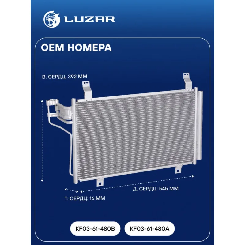 Радиатор кондиционера для автомобилей Mazda CX-5 (11-) Характеристики: Артикул: LRAC 251EP OEM номера: KF03-61-480B, KF03-61-480A Количество на автомобиль: 1 Длина сердцевины, мм: 545 Высота сердцевины, мм: 392 Толщина сердцевины, мм: 16 Сопутствующий товар: Ресиверы-осушители: LCR 2501 Сопутствующий товар: Радиаторы охлаждения: LRc 251EP Сопутствующий товар: Электровентиляторы охлаждения: LFK 25CX Сопутствующий товар: Компрессоры кондиционера: LCAC 2505 Ресивер: + Подходит для авто: Mazda CX-5 (12-), CX-5 (17-), CX-5 (17-) Для проверки применяемости отправьте VIN автомобиля через вкладку "Есть вопросы о товаре?" Комплектация: Паспорт изделия - 1 шт Радиатор кондиционера c ресивером - 1 шт Гарантия: от 1 года.