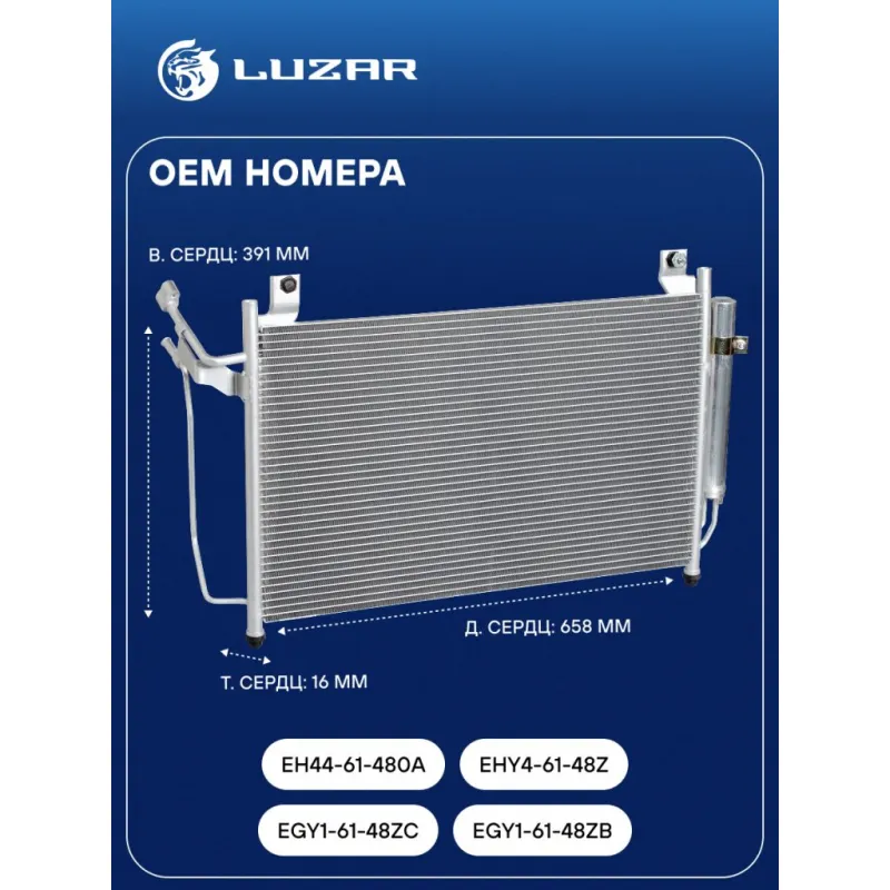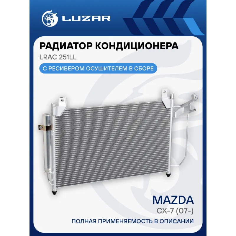 Радиатор кондиционера для автомобилей Mazda CX-7 (07-) Характеристики: Артикул: LRAC 251LL OEM номера: EGY1-61-48ZC, EGY1-61-48ZB, EH44-61-480A, EHY4-61-48Z Количество на автомобиль: 1 Длина сердцевины, мм: 658 Высота сердцевины, мм: 391 Толщина сердцевины, мм: 16 Сопутствующий товар: Ресиверы-осушители: LCR 2501 Сопутствующий товар: Радиаторы охлаждения: LRc 251LL Сопутствующий товар: Электровентиляторы охлаждения: LFc 2507; LFK 2507 Сопутствующий товар: Компрессоры кондиционера: LCAC 2507 Сопутствующий товар: Клапаны расширительные кондиционера (ТРВ): LTRV 2530 Ресивер: + Подходит для авто: Mazda CX-7 (07-), CX-7 (07-) Для проверки применяемости отправьте VIN автомобиля через вкладку "Есть вопросы о товаре?" Комплектация: Радиатор кондиционера в сборе с ресивером - 1 шт Паспорт изделия - 1 шт Радиатор кондиционера c ресивером - 1 шт Гарантия: от 1 года.