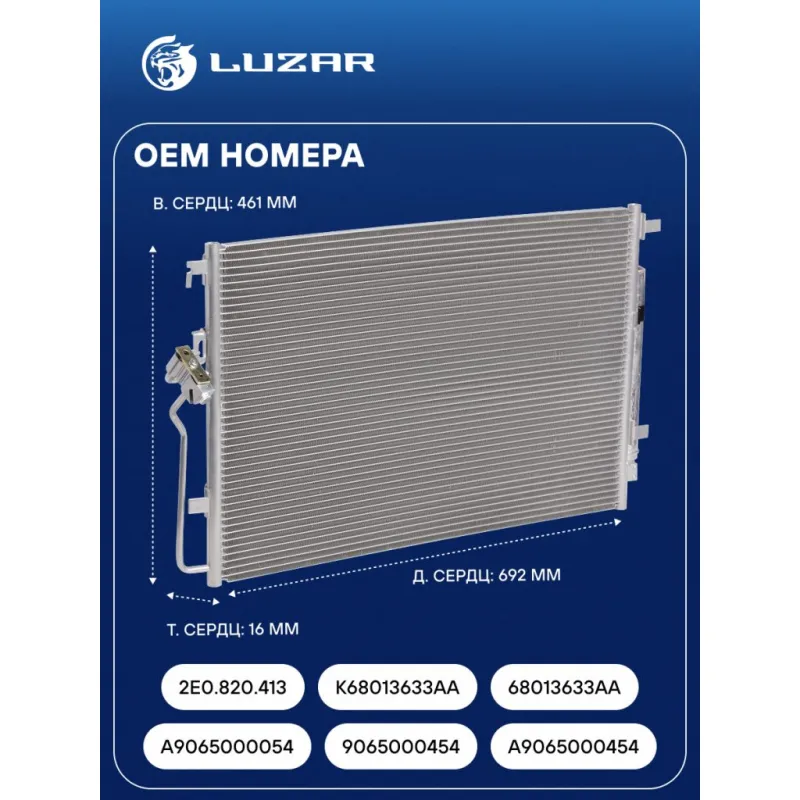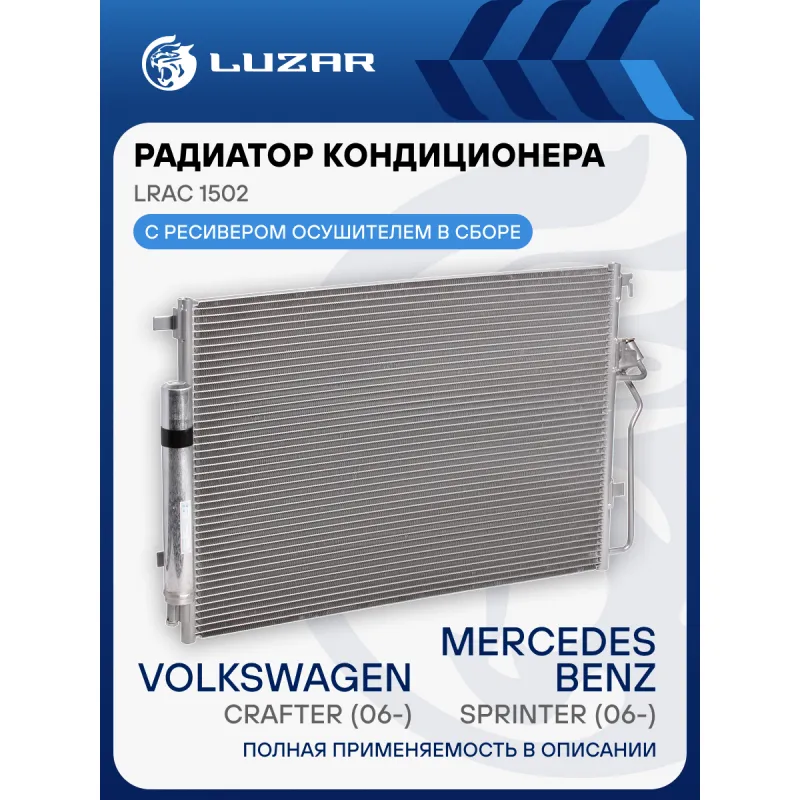 Радиатор кондиционера для автомобилей Mercedes-Benz Sprinter (06-)/Volkswagen Crafter (06-) Характеристики: Артикул: LRAC 1502 OEM номера: A9065000054, 9065000454, A9065000454, 2E0.820.413, K68013633AA, 68013633AA Количество на автомобиль: 1 Длина сердцевины, мм: 692 Высота сердцевины, мм: 461 Толщина сердцевины, мм: 16 Сопутствующий товар: Ресиверы-осушители: LCR 1502 Сопутствующий товар: Радиаторы охлаждения: LRc 1502; LRc 15102; LRc 1802 Сопутствующий товар: Компрессоры кондиционера: LCAC 15164 Сопутствующий товар: Клапаны расширительные кондиционера (ТРВ): LTRV 1550 Ресивер: + Подходит для авто: Mercedes-Benz Sprinter (06-) Volkswagen Crafter (06-) Для проверки применяемости отправьте VIN автомобиля через вкладку "Есть вопросы о товаре?" Комплектация: Радиатор кондиционера в сборе с ресивером - 1 шт Паспорт изделия - 1 шт Радиатор кондиционера c ресивером - 1 шт Гарантия: от 1 года.