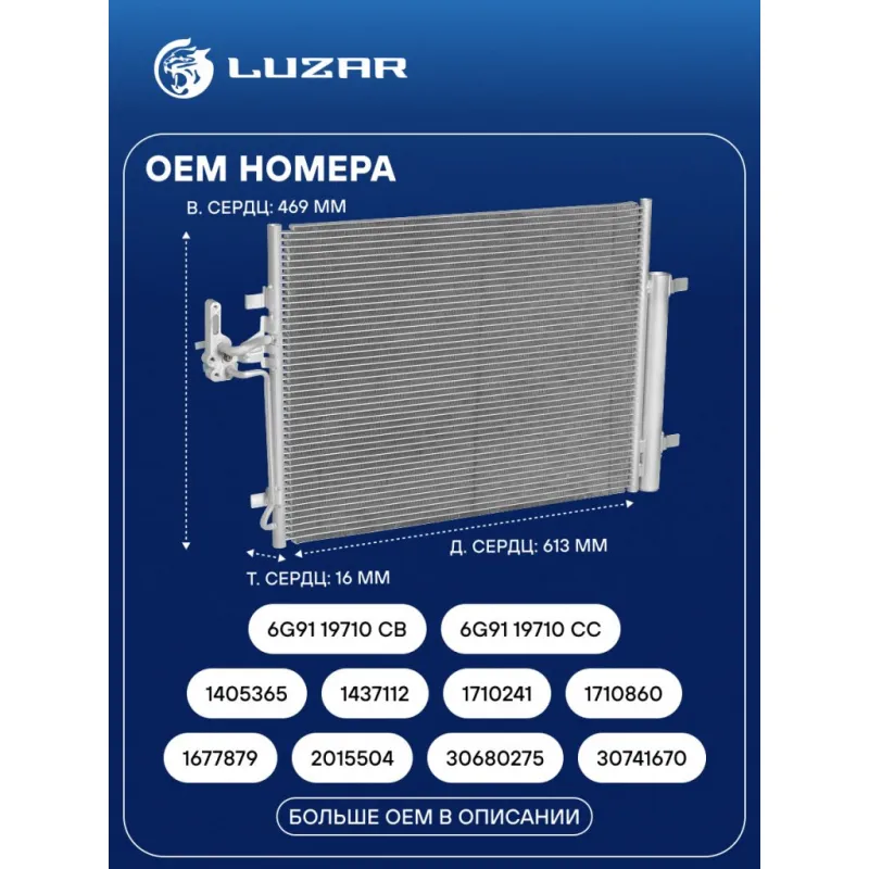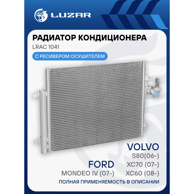 Радиатор кондиционера для автомобилей Mondeo IV (07-)/XC60 (08-)/XC70 (07-)/S80(06-) Характеристики: Артикул: LRAC 1041 OEM номера: 1405365, 1437112, 1710241, 1710860, 1677879, 2015504, 30680275, 30741670, 6G91 19710 CB, 6G91 19710 CC, LR023921, LR000566, 30794544, 9G9119710AA, 1453365, 1716734, 1460537, 1457675, 1563248, 1716737, 7G91 19710 AB, 7G91 19710 AA Сопутствующий товар: Ресиверы-осушители: LCD 0801 Комплектующие конденсера: LCD 0801 Количество на автомобиль: 1 Длина сердцевины, мм: 613 Высота сердцевины, мм: 469 Толщина сердцевины, мм: 16 Сопутствующий товар: Радиаторы охлаждения: LRc 10105; LRc 1041 Сопутствующий товар: Электровентиляторы охлаждения: LFK 1041; LFK 1042 Сопутствующий товар: Компрессоры кондиционера: LCAC 1010; LCAC 10122; LCAC 1041; LCAC 1054; LCAC 1078 Сопутствующий товар: Клапаны расширительные кондиционера (ТРВ): LTRV 1041 Ресивер: + Сопутсвующий товар: Датчики давления хладагента: LRPS 1041 Подходит для авто: Ford Galaxy II (06-), Mondeo IV (07-), S-Max (06-), S-Max (06-), Galaxy II (06-) Volvo S80 II (06-), V60 (10-), V70 (07-), XC70 (07-) Land Rover Freelander 2 (06-), Range Rover Evoque (11-) Для проверки применяемости отправьте VIN автомобиля через вкладку "Есть вопросы о товаре?" Комплектация: Паспорт изделия - 1 шт Радиатор кондиционера c ресивером - 1 шт Гарантия: от 1 года.