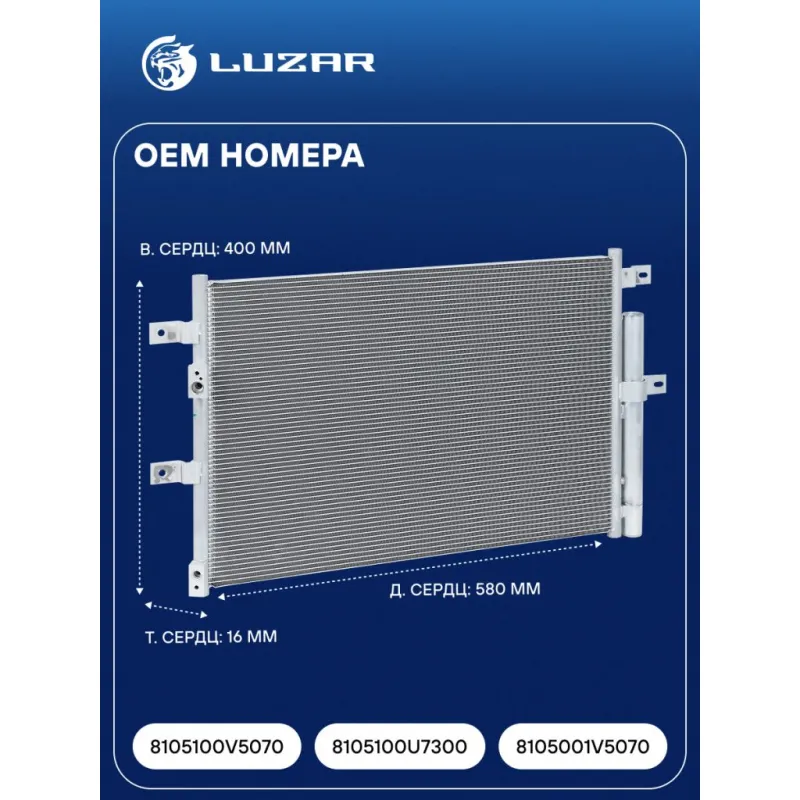 Радиатор кондиционера для автомобилей Москвич 3 (22-)/6 (23-)/JAC J7 (20-)/JS4 (20-) 1.5T Характеристики: Артикул: LRAC 3039 OEM номера: 8105100V5070, 8105100U7300, 8105001V5070 Количество на автомобиль: 1 Длина сердцевины, мм: 580 Высота сердцевины, мм: 400 Толщина сердцевины, мм: 16 Ресивер - осушитель: + Подходит для авто: JAC J7 (20-), JS4 (20-) MOSKVICH 3 (22-) Для проверки применяемости отправьте VIN автомобиля через вкладку "Есть вопросы о товаре?" Комплектация: Паспорт изделия - 1 шт Радиатор кондиционера c ресивером - 1 шт Гарантия: от 1 года.