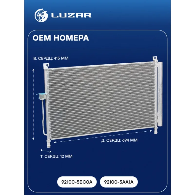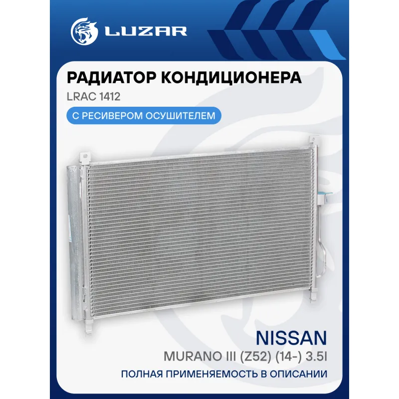 Радиатор кондиционера для автомобилей Murano III (Z52) (14-) 3.5i Характеристики: Артикул: LRAC 1412 OEM номера: 92100-5BC0A, 92100-5AA1A Количество на автомобиль: 1 Длина сердцевины, мм: 694 Высота сердцевины, мм: 415 Толщина сердцевины, мм: 12 Сопутствующий товар: Ресиверы-осушители: LCD 0801 Сопутствующий товар: Радиаторы охлаждения: LRc 1412 Сопутствующий товар: Электровентиляторы охлаждения: LFK 1442 Сопутствующий товар: Компрессоры кондиционера: LCAC 1452 Комплектующие конденсера: LCD 0801 осушитель: + Сопутсвующий товар: Датчики давления хладагента: LRPS 1401 Подходит для авто: Nissan Murano III (14-) Для проверки применяемости отправьте VIN автомобиля через вкладку "Есть вопросы о товаре?" Комплектация: Паспорт изделия - 1 шт Радиатор кондиционера c ресивером - 1 шт Гарантия: от 1 года.