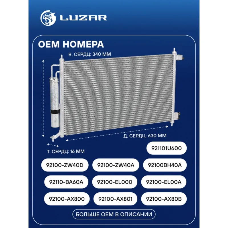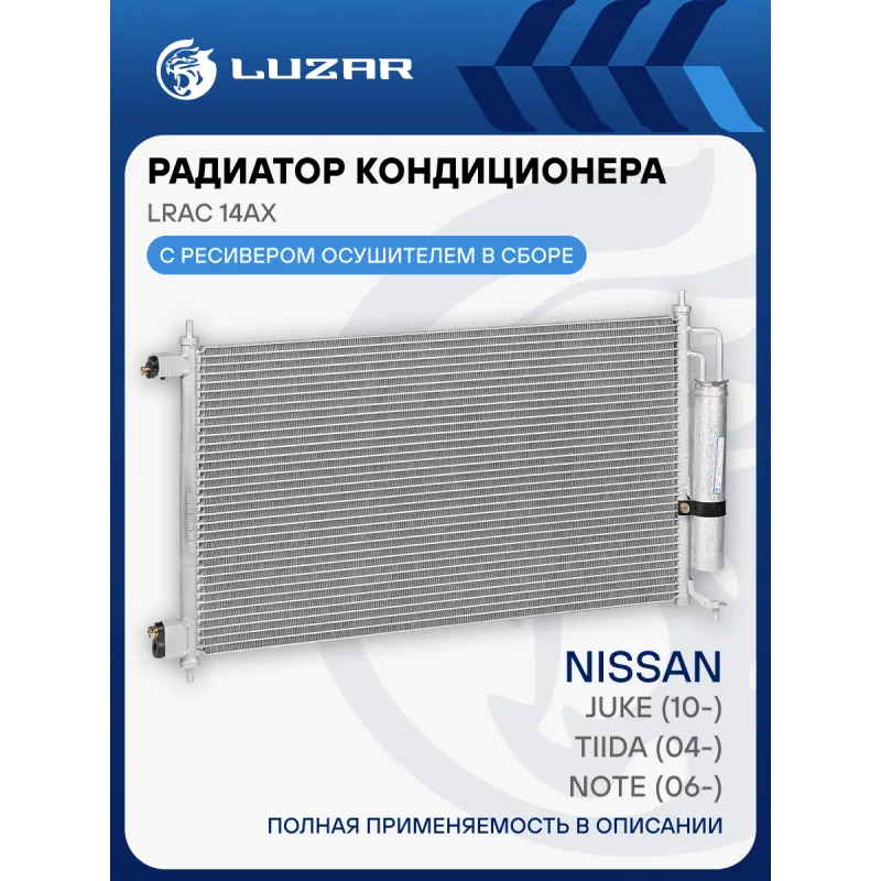 Радиатор кондиционера для автомобилей Note (06-)/Tiida (04-)/Juke (10-) Характеристики: Артикул: LRAC 14AX OEM номера: 92100-AX800, 92100-AX801, 92100-AX80B, 92110-BA60A, 92100-EL000, 92100-EL00A, 92100-ZW40D, 92100-ZW40A, 92100BH40A, 921101U600, 92100EW80A, 92100-BA60A Количество на автомобиль: 1 Длина сердцевины, мм: 630 Высота сердцевины, мм: 340 Толщина сердцевины, мм: 16 Сопутствующий товар: Ресиверы-осушители: LCR 1162; LCR 1402 Сопутствующий товар: Радиаторы охлаждения: LRc 141AX; LRc 141EE; LRc 14AX Сопутствующий товар: Электровентиляторы охлаждения: LFK 1411; LFK 14EL; LFK 14KA Сопутствующий товар: Компрессоры кондиционера: LCAC 1416; LCAC 14AX Сопутствующий товар: Клапаны расширительные кондиционера (ТРВ): LTRV 1404; LTRV 1406; LTRV 1416 Ресивер: + Сопутсвующий товар: Датчики давления хладагента: LRPS 1401 Подходит для авто: Nissan Tiida (15-), Sentra (14-), Note (06-), Micra K12 (02-), Tiida (04-), Juke (10-) Для проверки применяемости отправьте VIN автомобиля через вкладку "Есть вопросы о товаре?" Комплектация: Радиатор кондиционера в сборе с ресивером - 1 шт Паспорт изделия - 1 шт Гарантия: от 1 года.