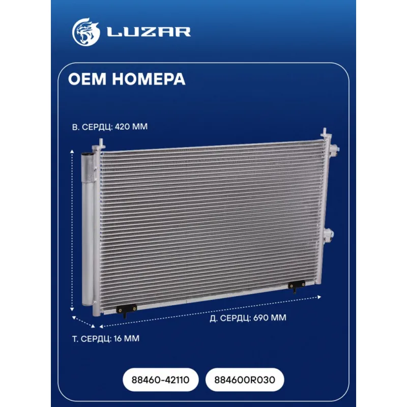 Радиатор кондиционера для автомобилей RAV4 (13-) Характеристики: Артикул: LRAC 1923 OEM номера: 88460-42110, 884600R030 Количество на автомобиль: 1 Длина сердцевины, мм: 690 Высота сердцевины, мм: 420 Толщина сердцевины, мм: 16 Сопутствующий товар: Ресиверы-осушители: LCD 0801 Сопутствующий товар: Радиаторы охлаждения: LRc 1936 Сопутствующий товар: Электровентиляторы охлаждения: LFK 1920 Сопутствующий товар: Компрессоры кондиционера: LCAC 1940 Сопутствующий товар: Клапаны расширительные кондиционера (ТРВ): LTRV 1920 Комплектующие конденсера: LCD 0801 Ресивер: + Сопутсвующий товар: Датчики давления хладагента: LRPS 1918 Подходит для авто: Toyota RAV 4 (13-) Для проверки применяемости отправьте VIN автомобиля через вкладку "Есть вопросы о товаре?" Комплектация: Паспорт изделия - 1 шт Радиатор кондиционера c ресивером - 1 шт Гарантия: от 1 года.