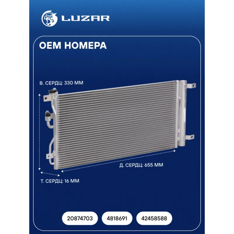 Радиатор кондиционера для автомобилей Сaptiva(06-)/Antara(06-) 2.0D(B20DTH)/2.2 D Характеристики: Артикул: LRAC 0553 OEM номера: 20874703, 4818691, 42458588 Количество на автомобиль: 1 Длина сердцевины, мм: 655 Высота сердцевины, мм: 330 Толщина сердцевины, мм: 16 Сопутствующий товар: Радиаторы охлаждения: LRc 05146; LRc 05190; LRc 0545 Сопутствующий товар: Клапаны расширительные кондиционера (ТРВ): LTRV 0543 Ресивер: + Подходит для авто: Chevrolet Captiva (06-), Captiva (06-) Opel Antara (06-), Antara (06-) Для проверки применяемости отправьте VIN автомобиля через вкладку "Есть вопросы о товаре?" Комплектация: Радиатор кондиционера в сборе с ресивером - 1 шт Паспорт изделия - 1 шт Радиатор кондиционера c ресивером - 1 шт Гарантия: от 1 года.