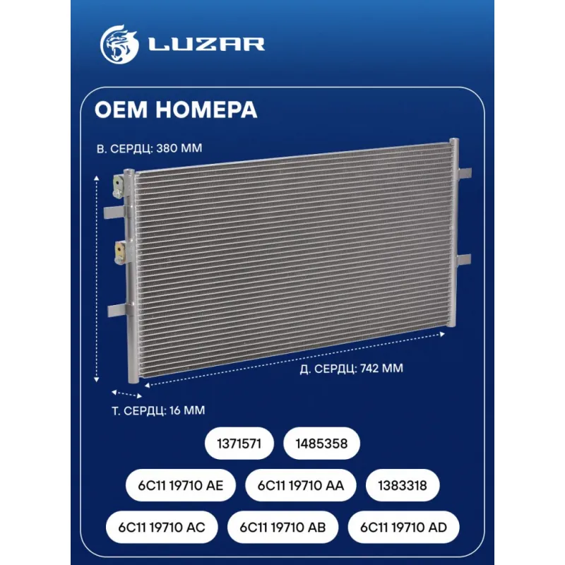 Радиатор кондиционера для автомобилей Transit (06-) Характеристики: Артикул: LRAC 10CC OEM номера: 1383318, 1371571, 1485358, 6C11 19710 AC, 6C11 19710 AB, 6C11 19710 AD, 6C11 19710 AE, 6C11 19710 AA Количество на автомобиль: 1 Длина сердцевины, мм: 742 Высота сердцевины, мм: 380 Толщина сердцевины, мм: 16 Сопутствующий товар: Радиаторы охлаждения: LRc 10AB; LRc 10CC Сопутствующий товар: Компрессоры кондиционера: LCAC 1089; LCAC 1690 Подходит для авто: Ford Transit VII (06-) Для проверки применяемости отправьте VIN автомобиля через вкладку "Есть вопросы о товаре?" Комплектация: Радиатор кондиционера Паспорт изделия - 1 шт Радиатор кондиционера c ресивером - 1 шт Гарантия: от 1 года.