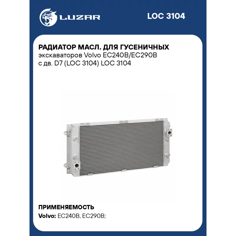 Радиатор масл. для гусеничных экскаваторов Volvo EC240B/EC290B с дв. D7 (LOC 3104) Характеристики: Артикул: LOC 3104 OEM номера: VOE14554053, VOE14514357, VOE14516222, VOE14517232 Материал: алюминий Трансмиссия: MT/AT Кондиционер: +/- Тип радиатора: масло-воздух Габариты изделия, мм: 980*545*110 Сопутствующий товар: Радиаторы охлаждения: LRc 3148 Материал сердцевины: Алюминий Тип сердцевины: Паяная Подходит для авто: Volvo EC240B, EC290B Для проверки применяемости отправьте VIN автомобиля через вкладку "Есть вопросы о товаре?" Комплектация: Масляный радиатор - 1 шт Паспорт изделия - 1 шт Гарантия: от 1 года.