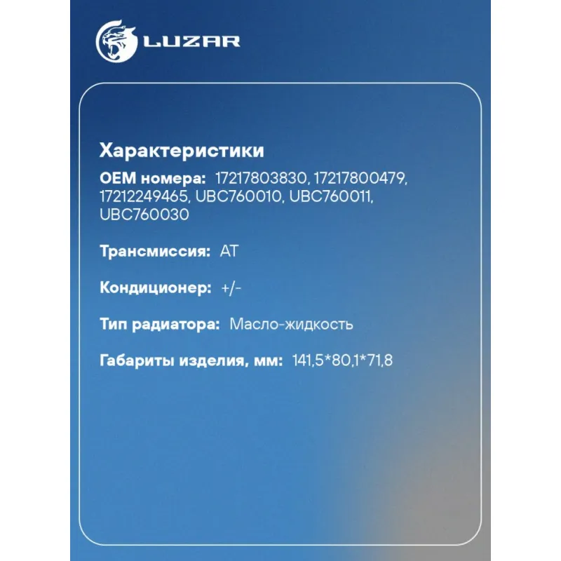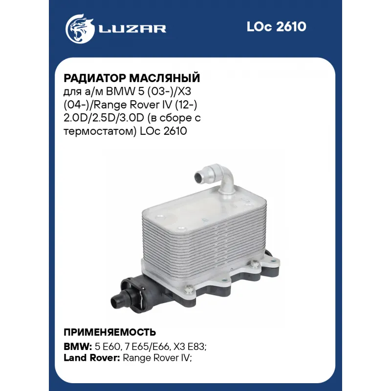 Радиатор масляный для а/м BMW 5 (03-)/X3 (04-)/Range Rover IV (12-) 2.0D/2.5D/3.0D (в сборе с термостатом) Характеристики: Артикул: LOc 2610 OEM номера: 17217803830, 17217800479, 17212249465, UBC760010, UBC760011, UBC760030 Материал: алюминий Трансмиссия: AT Кондиционер: +/- Габариты изделия, мм: 141,5*80,1*71,8 Сопутствующий товар: Радиаторы охлаждения: LRc 10170; LRc 26180; LRc 26110 Тип радиатора: масло-жидкость Тип конструкции: охладитель АКПП в сборе с термостатом Температура открытия, ?С: 95°С Подходит для авто: BMW 5 E60 (03-), 7 E65/E66 (01-), X3 E83 (04-) Land Rover Range Rover IV (12-) Для проверки применяемости отправьте VIN автомобиля через вкладку "Есть вопросы о товаре?" Комплектация: Радиатор масляный в сборе с термостатом - 1 шт Паспорт изделия - 1 шт Гарантия: от 1 года.