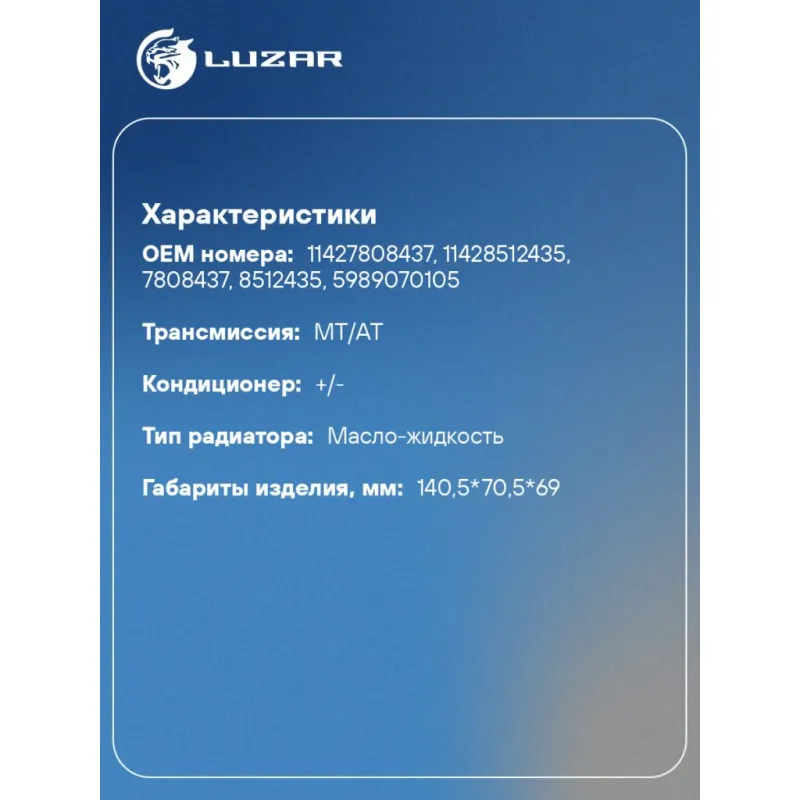 Радиатор масляный для а/м BMW X5 (E70) (07-)/X6 (E71) (07-)/5 (F10) (09-) 3.0D [N57] Характеристики: Артикул: LOc 2601 OEM номера: 11427808437, 11428512435, 7808437, 8512435, 5989070105 Материал: алюминий Трансмиссия: MT/AT Кондиционер: +/- Габариты изделия, мм: 140,5*70,5*69 Сопутствующий товар: Радиаторы охлаждения: LRc 26194; LRc 26114 Сопутствующий товар: Радиаторы интеркулера (онв): LRIC 2613 Тип радиатора: масло-жидкость Назначение: маслоохладитель двигателя Подходит для авто: BMW 3 E90 (05-), 5 F10/F11/F07 (10-), 7 F01/F02 (08-), X5 E70 (07-), X6 E71 (08-) Для проверки применяемости отправьте VIN автомобиля через вкладку "Есть вопросы о товаре?" Комплектация: Радиатор масляный - 1 шт Паспорт изделия - 1 шт Гарантия: от 1 года.