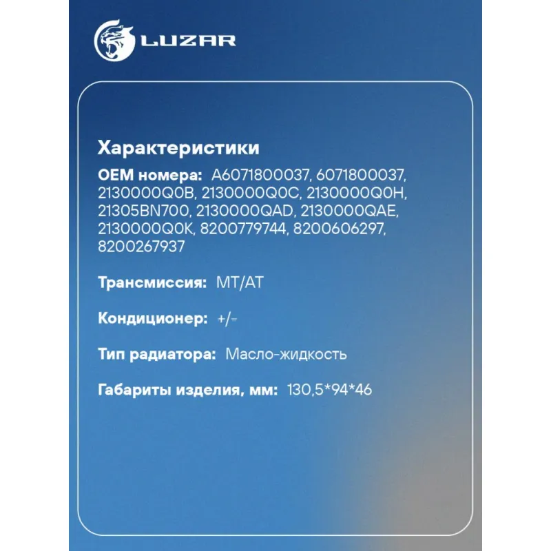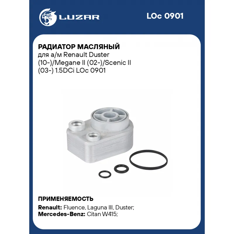 Радиатор масляный для а/м Renault Duster (10-)/Megane II (02-)/Scenic II (03-) 1.5DCi Характеристики: Артикул: LOc 0901 OEM номера: A6071800037, 6071800037, 2130000Q0B, 2130000Q0C, 2130000Q0H, 21305BN700, 2130000QAD, 2130000QAE, 2130000Q0K, 8200779744, 8200606297, 8200267937, 1660084A00, 8200923115, 1660084A00000 Материал: алюминий Трансмиссия: MT/AT Кондиционер: +/- Габариты изделия, мм: 130,5*94*46 Сопутствующий товар: Радиаторы охлаждения: LRc 0901; LRc 0978; LRc 0909 Сопутствующий товар: Радиаторы интеркулера (онв): LRIC 0910 Тип радиатора: масло-жидкость Комплектация:: уплотнительные кольца в комплекте Примечание: маслоохладитель двигателя Подходит для авто: Renault Fluence (10-), Laguna III (07-), Duster (10-), Logan II (12-), Kangoo II (07-), Megane III (08-), Megane II (02-) Mercedes-Benz Citan W415 (12-), B-Class W246 (13-) Для проверки применяемости отправьте VIN автомобиля через вкладку "Есть вопросы о товаре?" Комплектация: Радиатор масляный Паспорт изделия Уплотнительные резиновые кольца - 3 шт Гарантия: от 1 года.