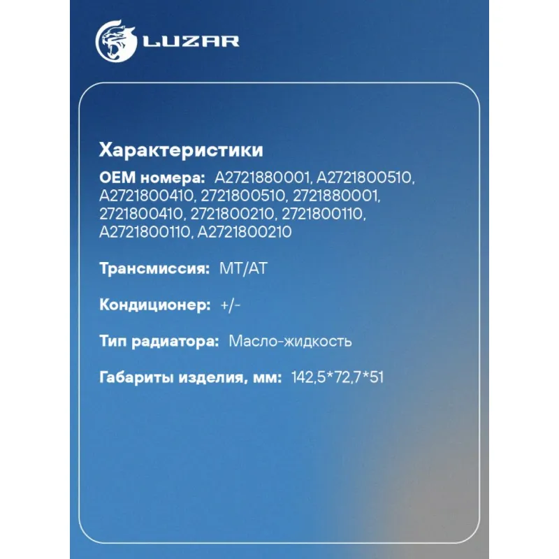 Радиатор масляный для автомобилей MB ML (W164) (05-)/E (W212) (09-) [M272; M273] Характеристики: Артикул: LOc 1502 OEM номера: A2721880001, A2721800510, A2721800410, 2721800510, 2721880001, 2721800410, 2721800210, 2721800110, A2721800110, A2721800210 Материал: алюминий Трансмиссия: MT/AT Кондиционер: +/- Тип радиатора: масло-жидкость Габариты изделия, мм: 142,5*72,7*51 Комплектация:: уплотнительные прокладки в комплекте (2 шт.) Подходит для авто: Mercedes-Benz M-Class II (W164) (05-), C-Class W203 (00-), C-Class W204 (07-), CLS C219 (04-), CLS C219 (04-), CLS C219 (04-), E-Class W211 (02-), E-Class W212 (09-), R-Class (W251) (06-), S-Class W221 (05-), SLK R171 (04-), Sprinter (06-), Viano (W639) (03-), Vito (W639) (03-) Для проверки применяемости отправьте VIN автомобиля через вкладку "Есть вопросы о товаре?" Комплектация: Радиатор масляный Уплотнительные прокладки - 2 шт Паспорт изделия Гарантия: от 1 года.