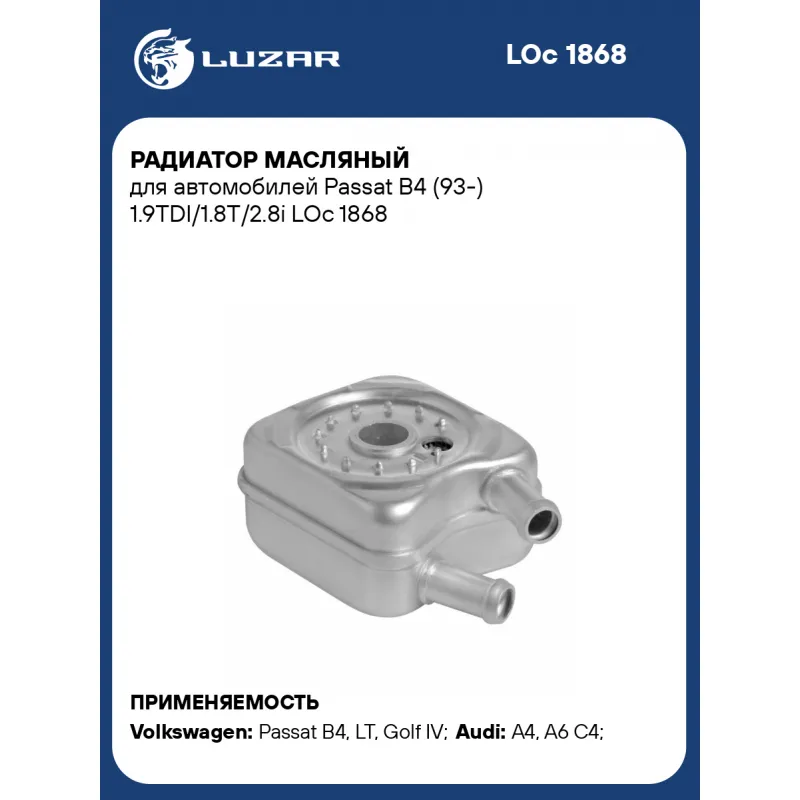 Радиатор масляный для автомобилей Passat B4 (93-) 1.9TDI/1.8T/2.8i Характеристики: Артикул: LOc 1868 OEM номера: 068117021BX, 068117021BV, 068 117 021 B Материал: алюминий Тип радиатора: масло-жидкость Трансмиссия: MT/AT Габариты изделия, мм: 92*54*92 Кондиционер: +/- Сопутствующий товар: Радиаторы охлаждения: LRc 1802; LRc 1812; LRc 181DP; LRc 18J0 Подходит для авто: Volkswagen Passat B4 (93-), LT (96-), Golf IV (97-), Bora (99-), Crafter (06-), Transporter T4 (90-) Audi A4 (97-), A6 C4 (94-) Для проверки применяемости отправьте VIN автомобиля через вкладку "Есть вопросы о товаре?" Комплектация: Радиатор масляный Прокладка Паспорт изделия Гарантия: от 1 года.